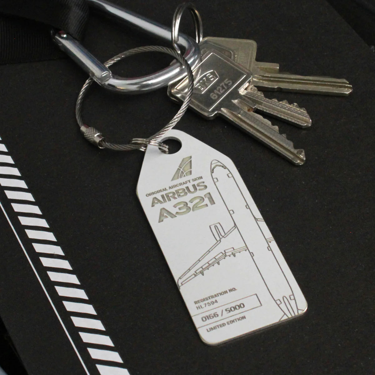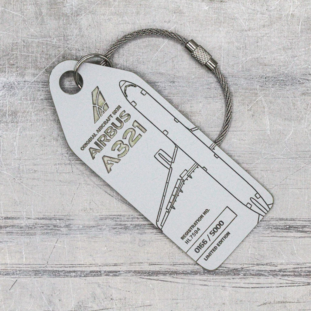 Note: Every tag is unique. Depending on the plane, tags may vary in terms of haptics, material thickness and colour. Small blemishes bear witness to the plane’s long history and are an authentic reminder of its glory days over the clouds. Small scratches, flaky paint and imperfections are totally normal and give our Aviationtags their unique charm – the charm of a vintage product crafted from upcycled materials.These quirks are not the result of the production process, they simply reflect the state of the aircraft material we use when it was extracted. The original aircraft paint of this edition is rather sensitive, so please take good care of your tag!