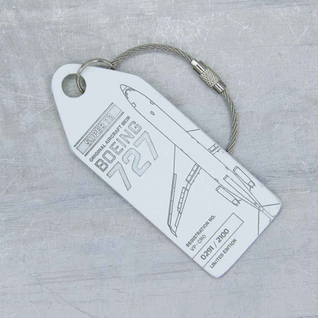 Throughout its VIP career, the aircraft flew globally under various registrations, including VR-COJ and N31TR, and was most recently operated by MK Airlines. In 2010, it was retired and brought to Lasham, UK, where it remained parked and was eventually scrapped in 2014. Parts of its fuselage were preserved – and now live on as this special Aviationtag edition. The tags reflect the aircraft’s exclusive character, combining classic jetliner heritage with a rare VIP past. Whether you're an Aviationtag collector, a Boeing 727 enthusiast or simply someone who appreciates the story behind the metal – this tag is a true piece of aviation history.Manufacturer: Boeing