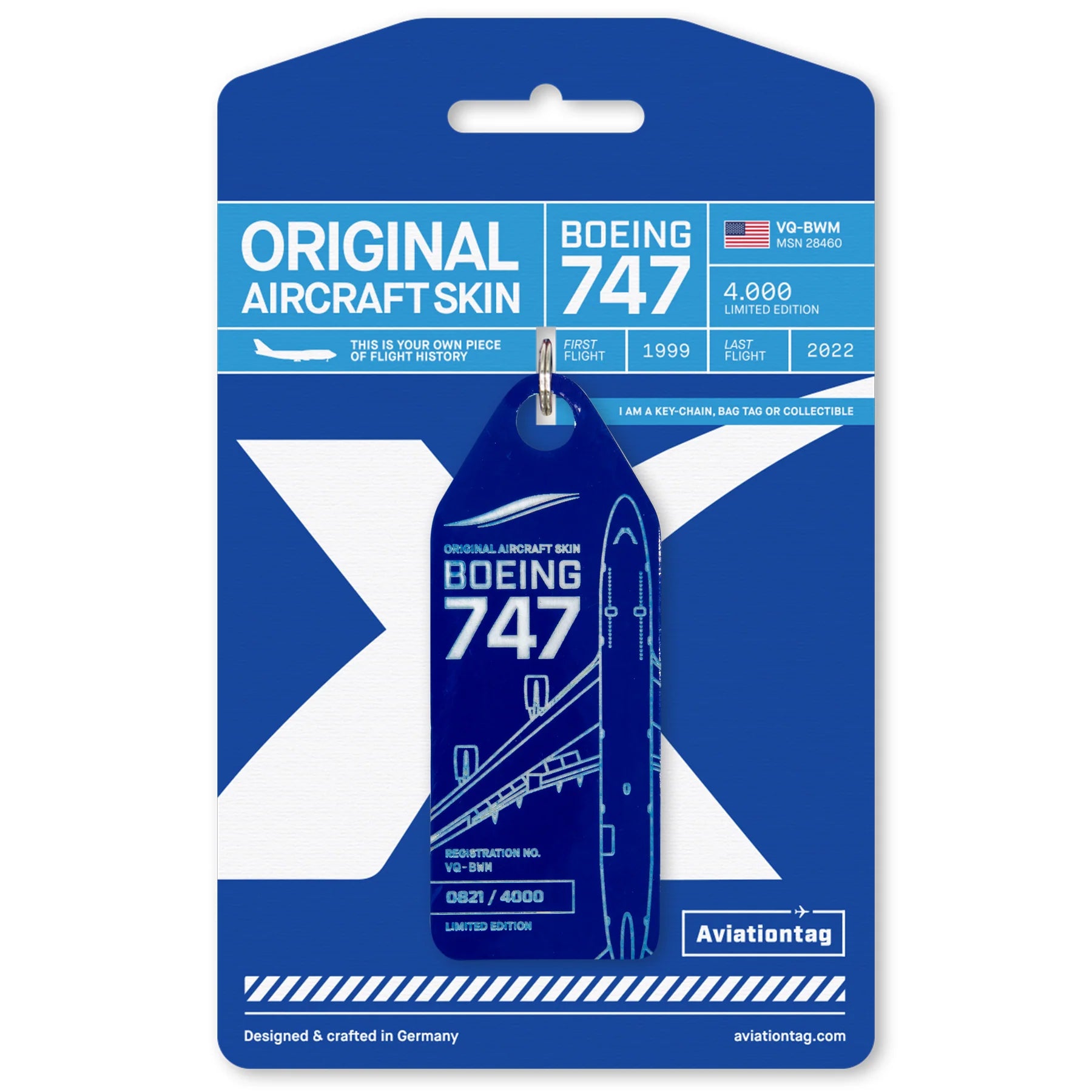 Celebrate with us one of the last built Boeing 747 Combi aircraft with this exclusive Aviationtag. Made from the fuselage of the Boeing 747-400M, MSN 28460, with each tag you hold a true piece of aviation rarity in your hand. The aircraft entered service in 1999 with KLM as PH-BFV and was in operation for over two decades as a passenger-freight “Combi” Jumbo – one of only 61 built of this type. Under the name “City of Vancouver” it connected Amsterdam with the world. In its second chapter, it flew as VQ-BWM with JetOneX (operated by Longtail Aviation) freight on long-haul routes – briefly the only Boeing 747-400M in commercial service worldwide.