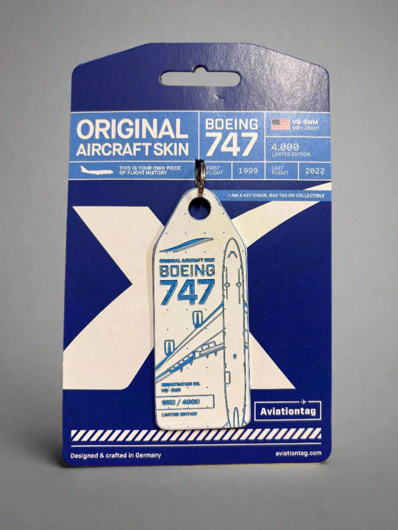Celebrate with us one of the last built Boeing 747 Combi aircraft with this exclusive Aviationtag. Made from the fuselage of the Boeing 747-400M, MSN 28460, with each tag you hold a true piece of aviation rarity in your hand. The aircraft entered service in 1999 with KLM as PH-BFV and was in operation for over two decades as a passenger-freight “Combi” Jumbo – one of only 61 built of this type. Under the name “City of Vancouver” it connected Amsterdam with the world. In its second chapter, it flew as VQ-BWM with JetOneX (operated by Longtail Aviation) freight on long-haul routes – briefly the only Boeing 747-400M in commercial service worldwide.