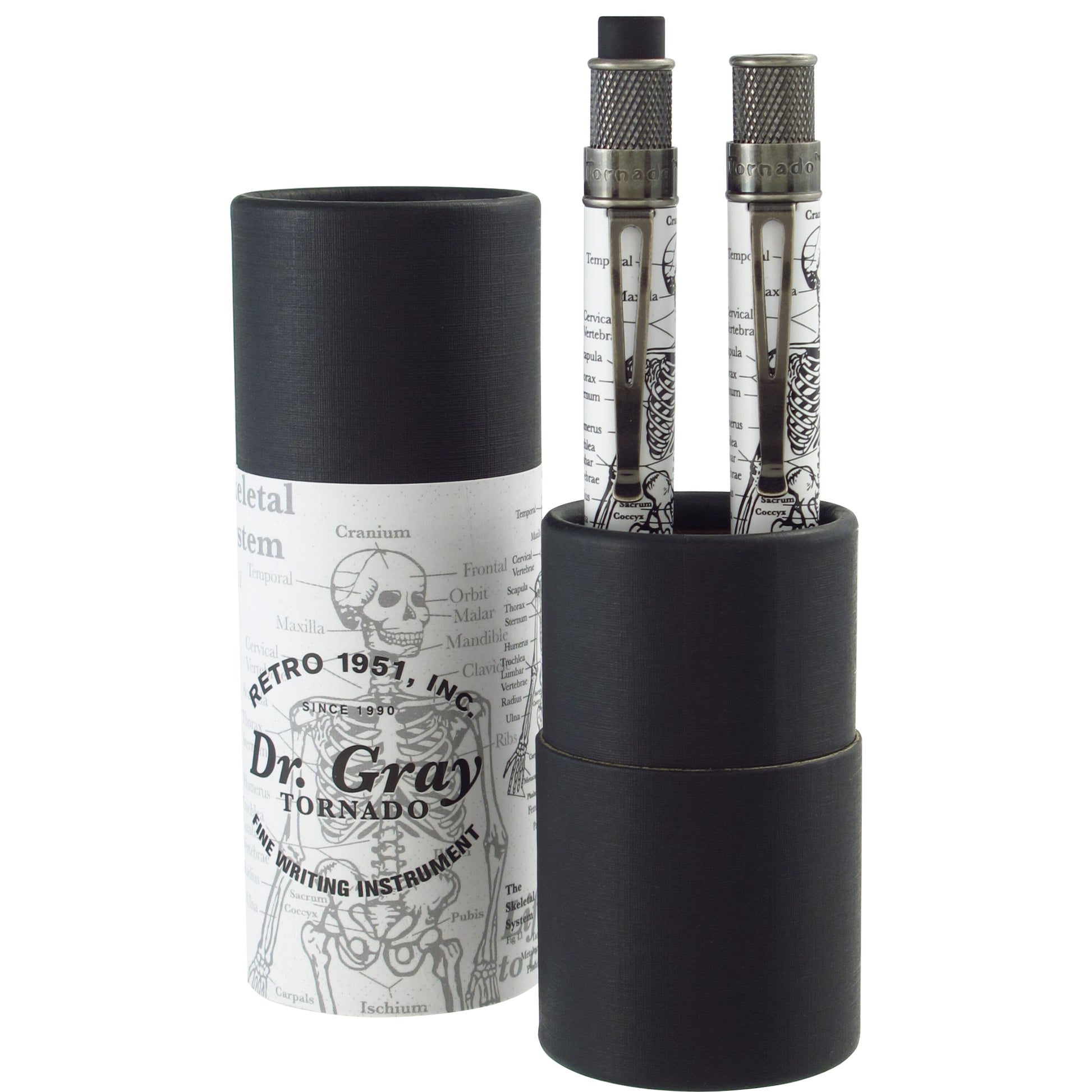 Retro 51 Tornado Vintage Metalsmith rollerball pen and pencil set, "Dr. Gray", an ode to Henry Gray, well known for his book on the human anatomy. The pen/pencil has a glow-in-the-dark lacquer finish barrel and an antique silver trim.