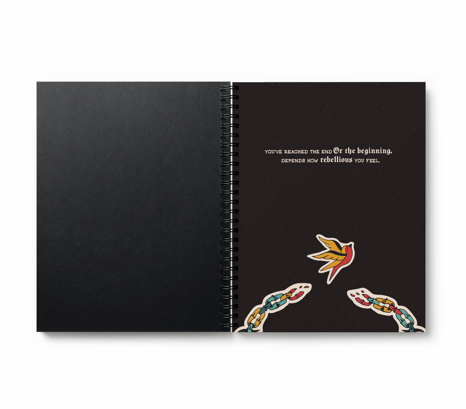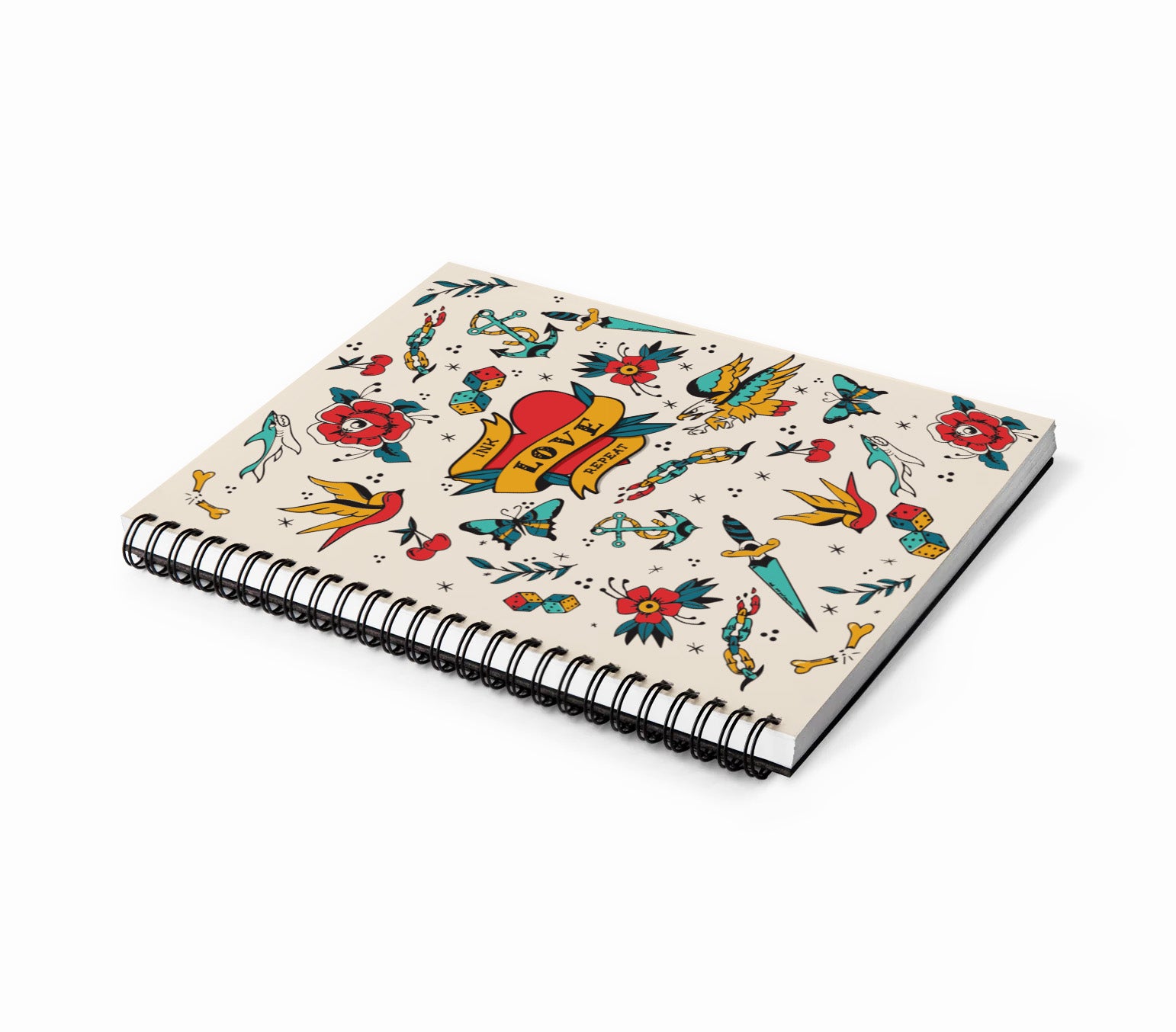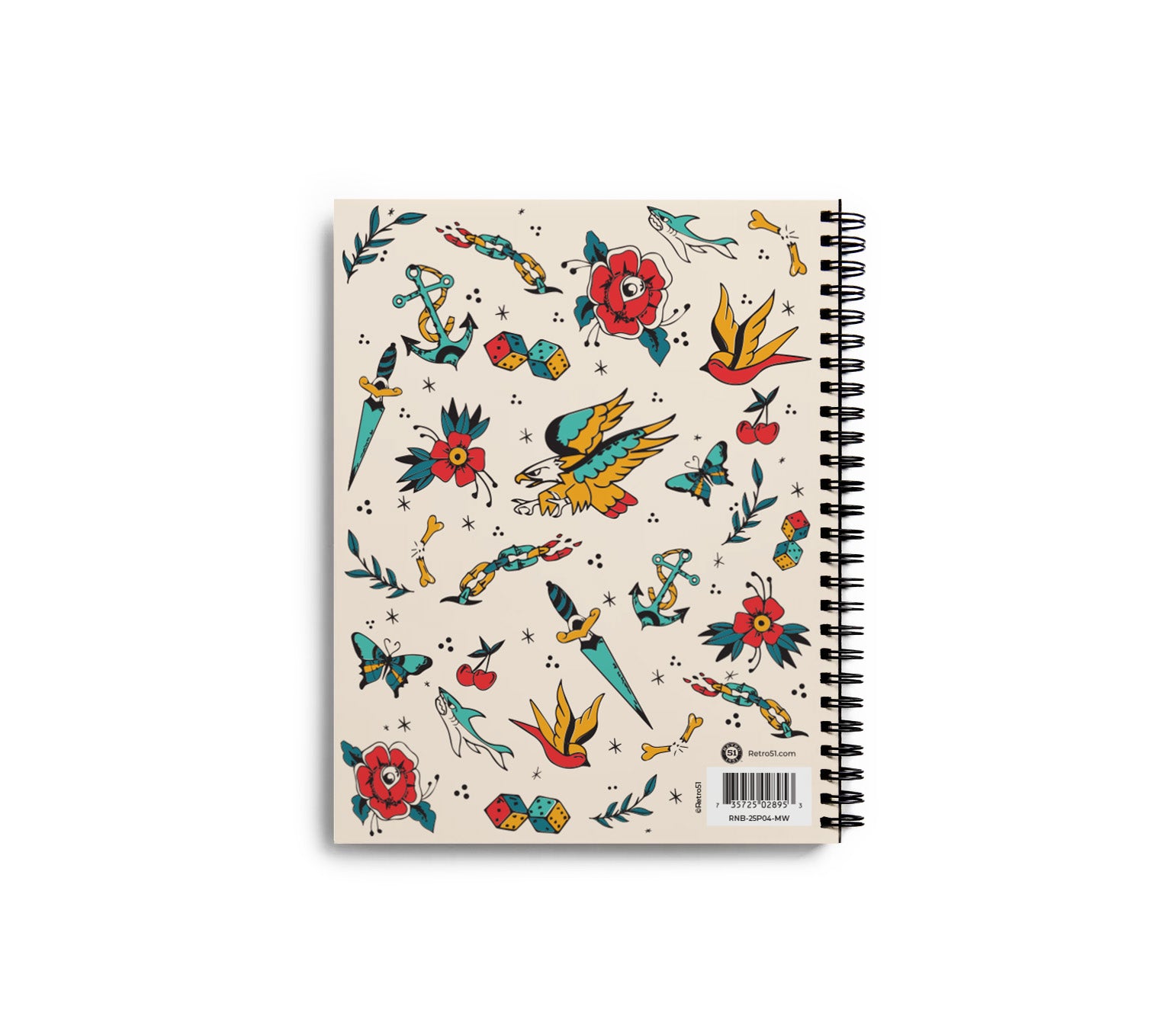 This tattoo-inspired spiral sketchbook is packed with bold attitude and classic flair. The cover bursts with bright colors, thick lines, and timeless symbols of luck, love, and rebellion—paying homage to the American Traditional tattoo style that never goes out of fashion. Inside, you'll find smooth, quality pages ready for your boldest doodles, wildest sketches, or everyday notes. Whether you're drawing, journaling, or just daydreaming, this sketchbook is here to bring a flash of flair to your creative flow.