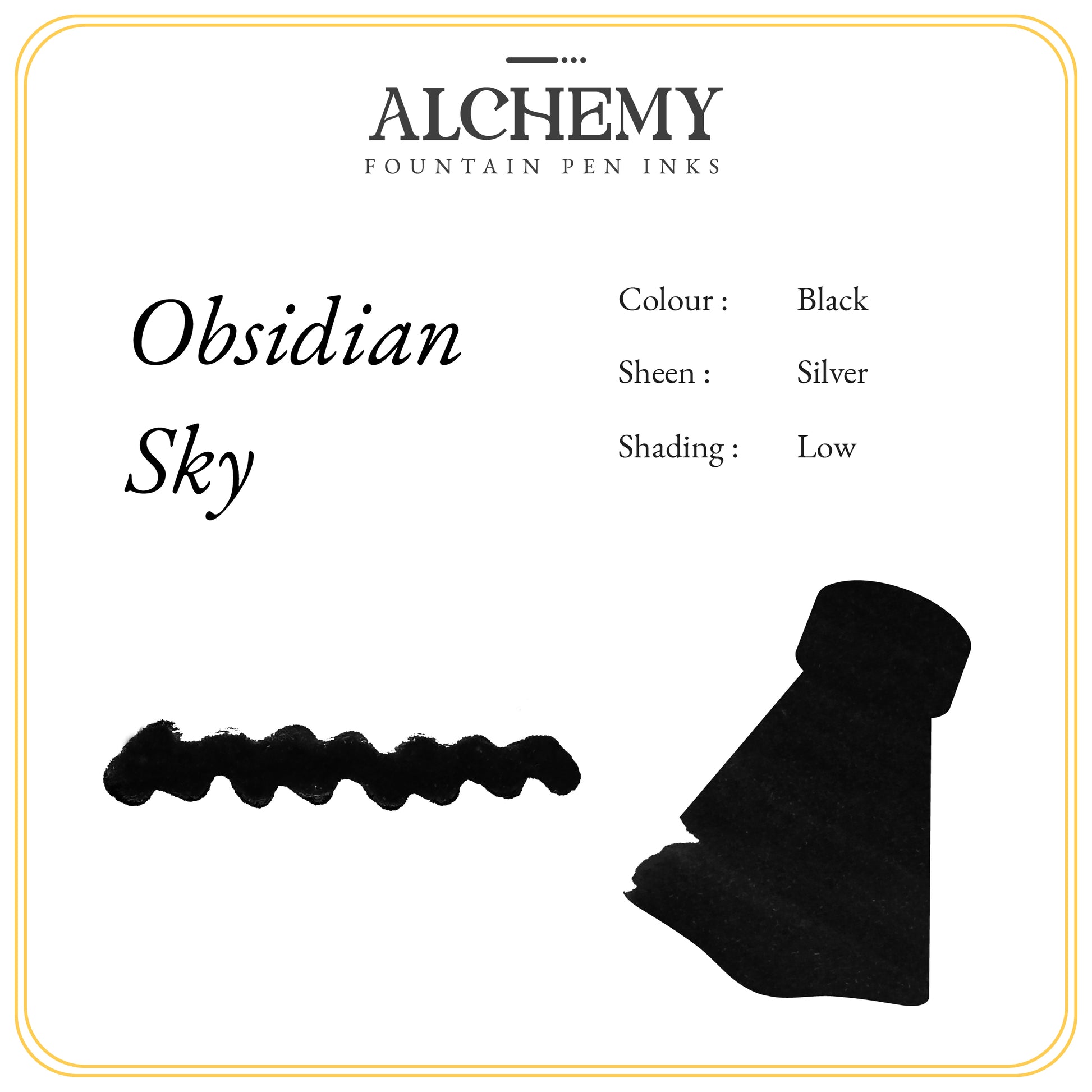 Obsidian Sky conjures the rolling thunder and flashing brilliance of a darkened horizon. A rich black base ink flecked with silver sheen.