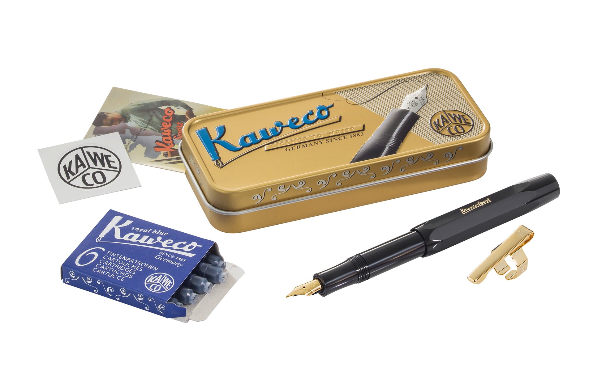 This Kaweco CLASSIC Sport fountain pen gift set contains 1 Kaweco CLASSIC Sport fountain pen with medium nib, 1 gold clip, and 1 pack of Kaweco ink cartridges, all presented in a Kaweco nostalgic gift tin.