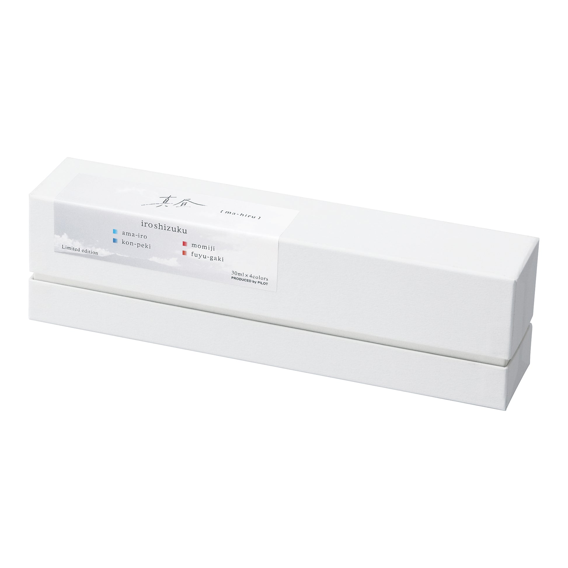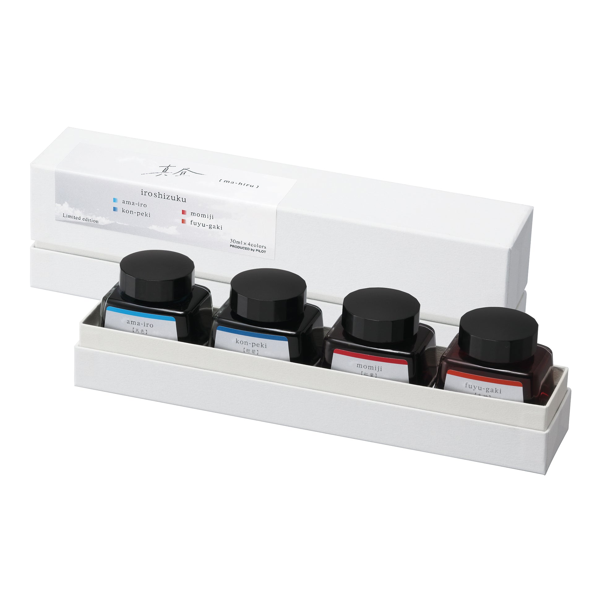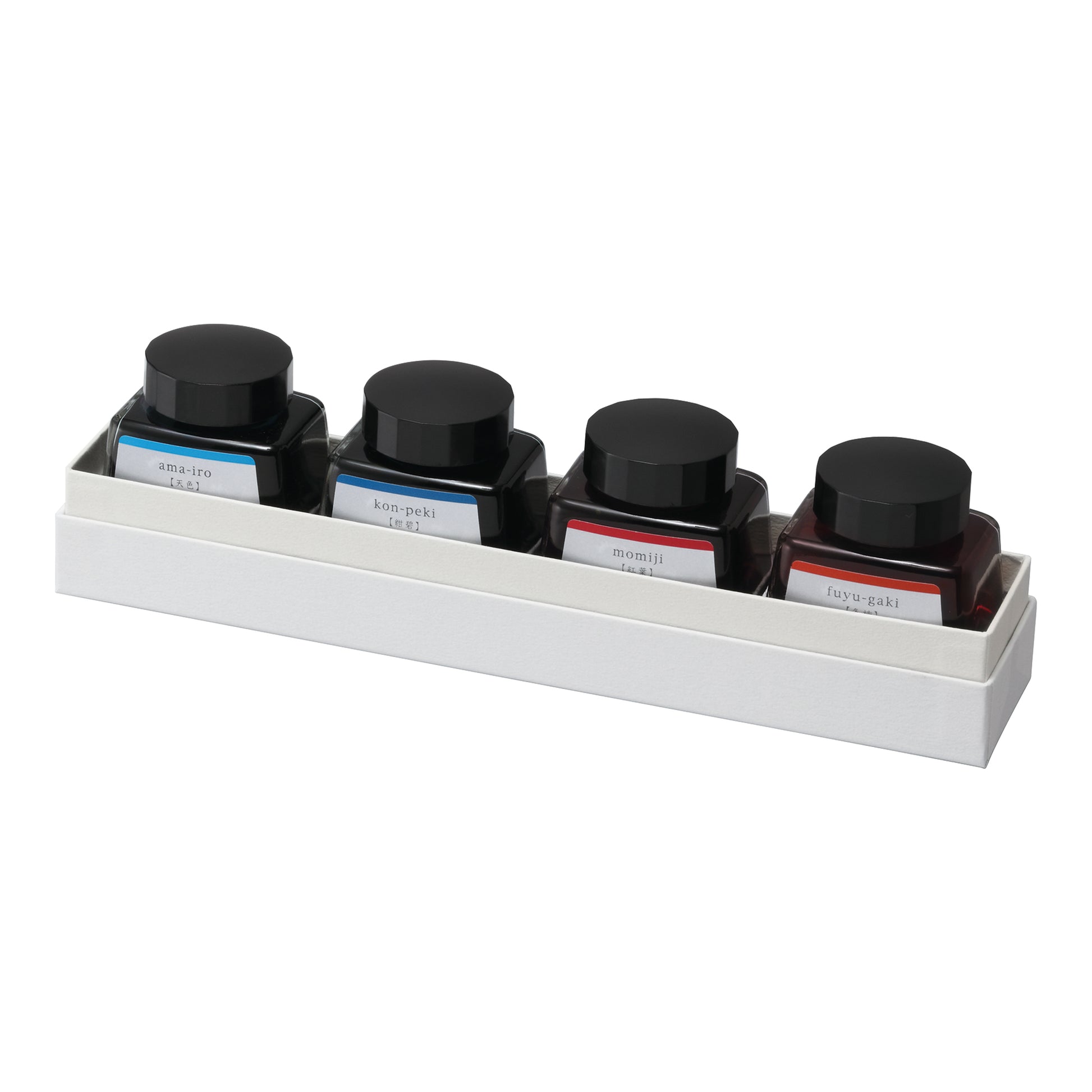This limited edition ink set includes four 30ml ink bottles supplied in an attractive box. Ma-Hiru (Midday) includes: Ama-Iro Blue (Sky Blue), Kon-Peki Blue (Deep Cerulean), Momiji Red (Autumn Leaves), Fuyu-Gaki Orange (Winter Persimmon).