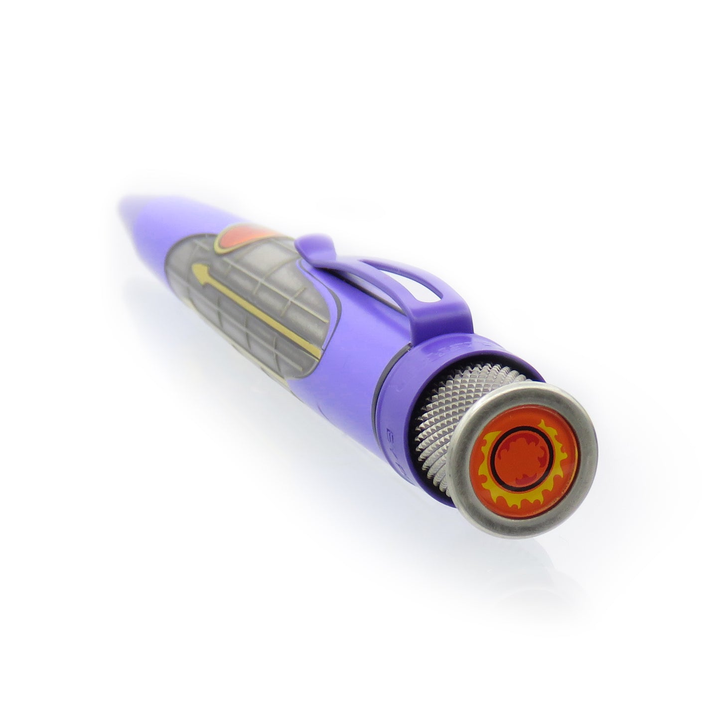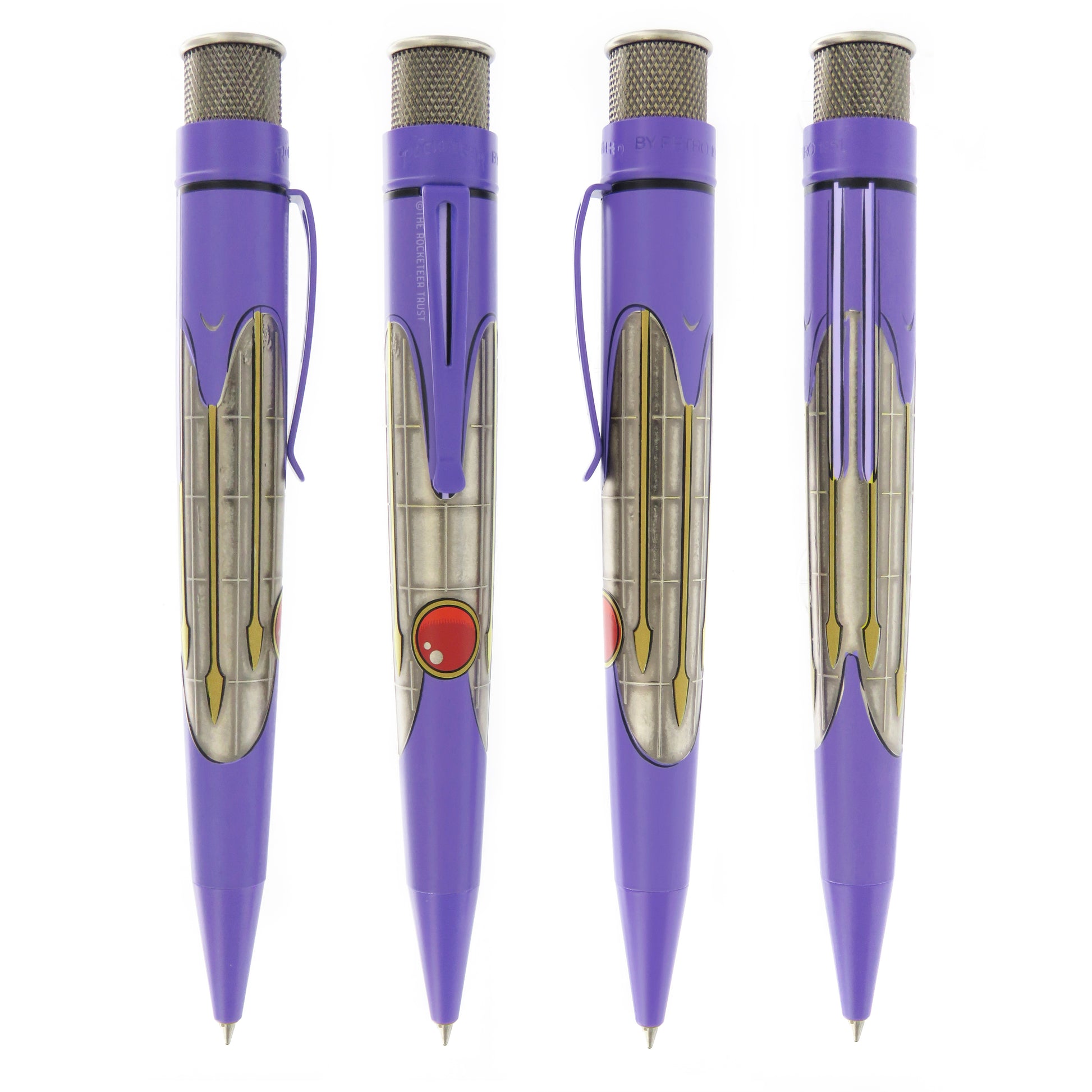 Your Rocketeer collection wouldn’t be complete without the rocket-pack! This clever design utilizes the extra girth of the Big Shot rollerball’s body to depict the original rocket in all its purple glory! Complete with acid-etched details, stonewashed pewter accents, and a fiery top disc – this pulpy, comic-accurate representation of the rocket will set your collection ablaze. Limited Edition of 800. Each pen is numbered on the top ring and comes packaged in a custom black tube with gold foil stamped art!