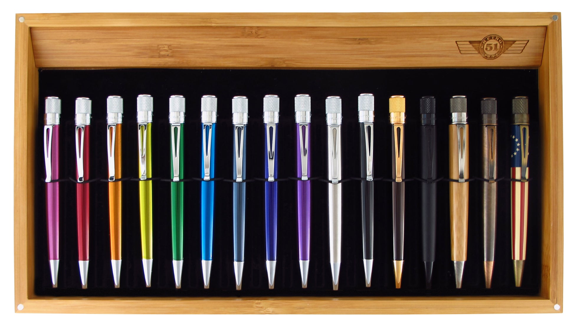 Bamboo constructed tray with velveteen insert that holds sixteen Retro pens protected by a clear acrylic cover with magnetic attachment. A donation is made to the Arbor Day Foundation with each tray’s sale. See page 6 for details about this donation.