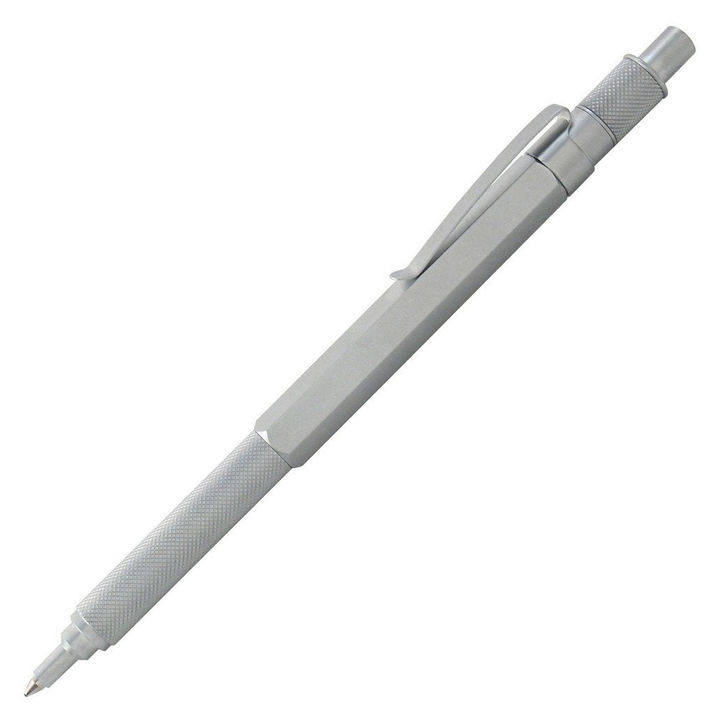 Its faceted, all metal barrel has a knurled grip section and has a click action button for advancing the refill.