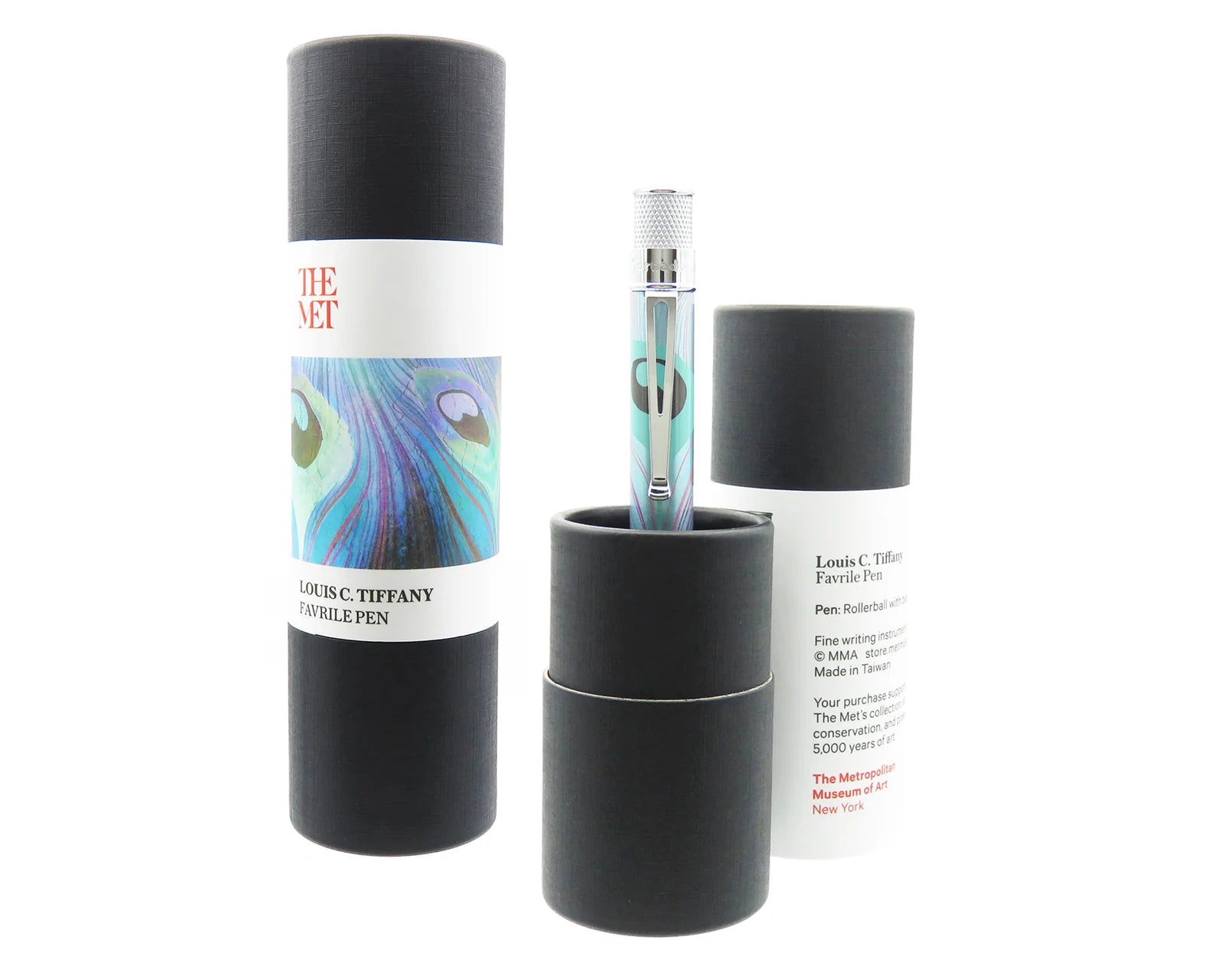 Tiffany's Favrile Tornado rollerball pen recalls an iridescent Favrile glass vase (ca. 1900) with a peacock feather motif, produced by the Tiffany Glass and Decorating Company (American, 1892–1902). It's been printed with shimmering metallic inks finished with chrome accents.