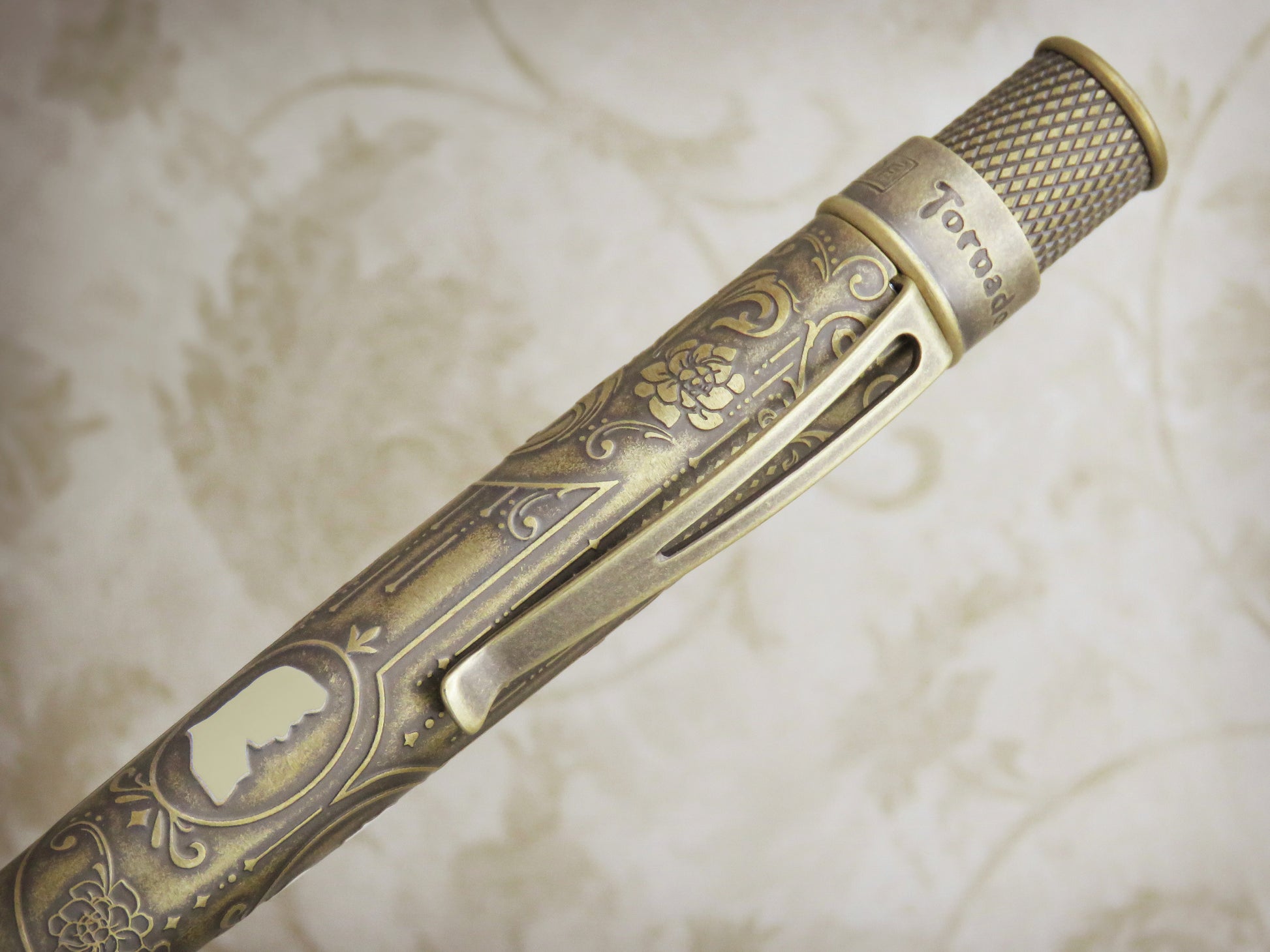 Retro51 is pleased to introduce one of literature's most cherished novels to the Literary Collection—the Pride andPrejudice Tornado™ Rollerball! Inspired by Jane Austen's timeless tale of love, wit, and social intricacies, this pen features an elegant design with intricate patterns, flowers and brooch-like profile portraits etching against the beautiful stonewashed brass and of the novel's two central characters, Elizabeth Bennet and Fitzwilliam Darcy, evoking the Regency era—perfect for fans of this classic literature.