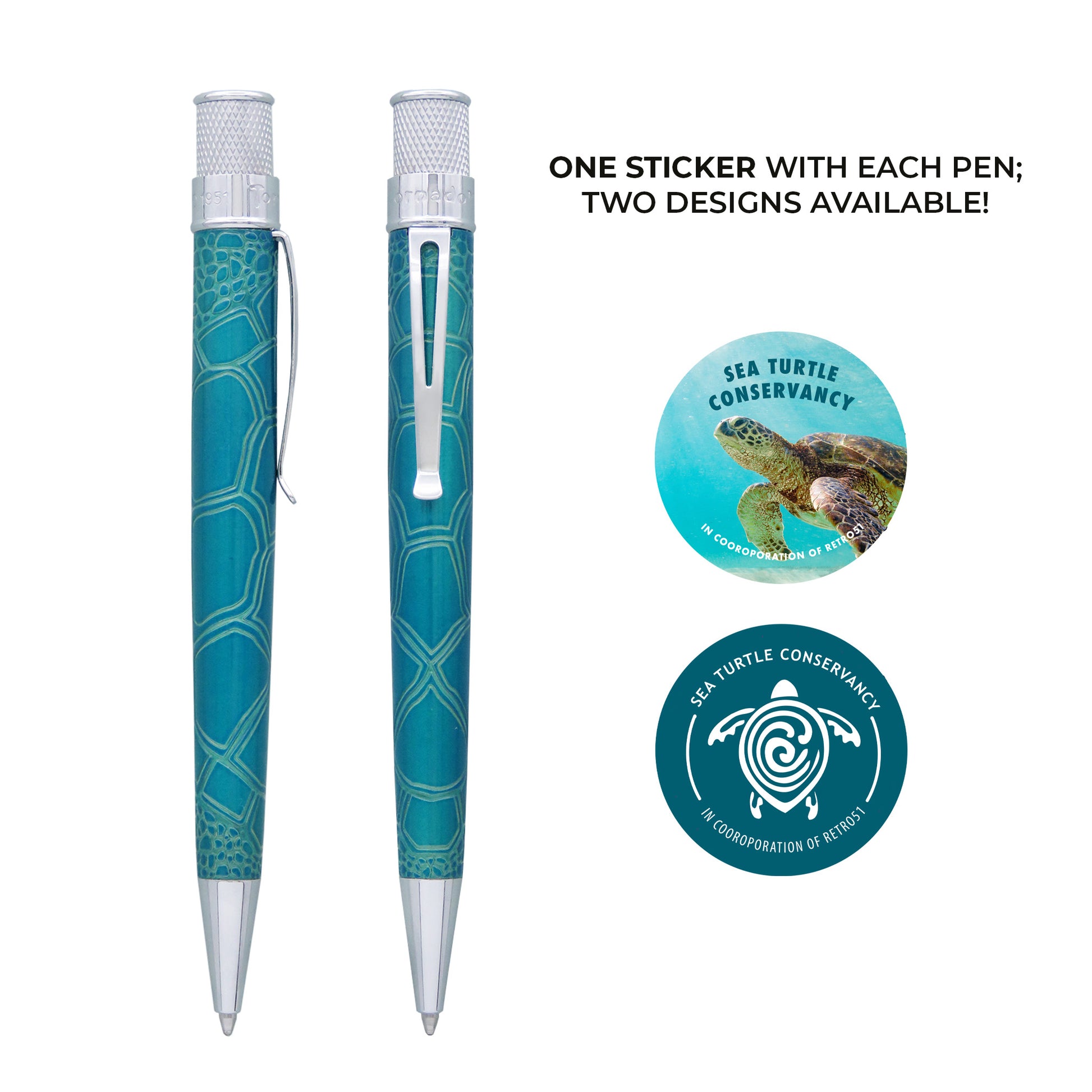 this Tornado™ features an acid-etched sea turtle shell pattern, beautifully lacquered in a vibrant sea turquoise color. The texture of the shell in hand combined with the Easy Flow ballpoint makes for a fluid writing experience. With each Turtle Rescue sold, a donation is made to the Sea Turtle Conservancy to help protect these endangered reptiles, the environment they depend on plus educating the public.