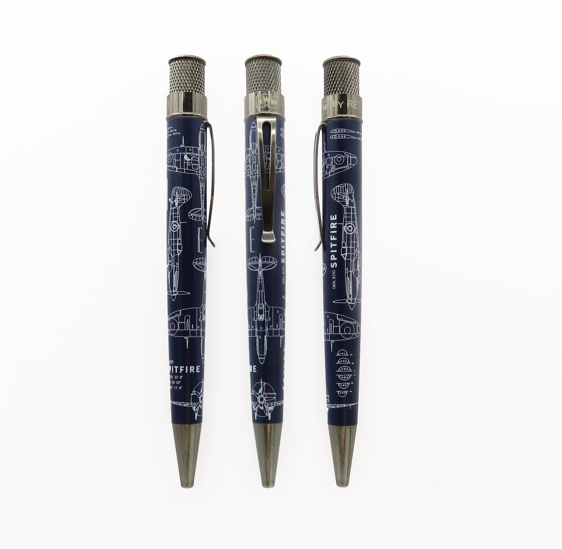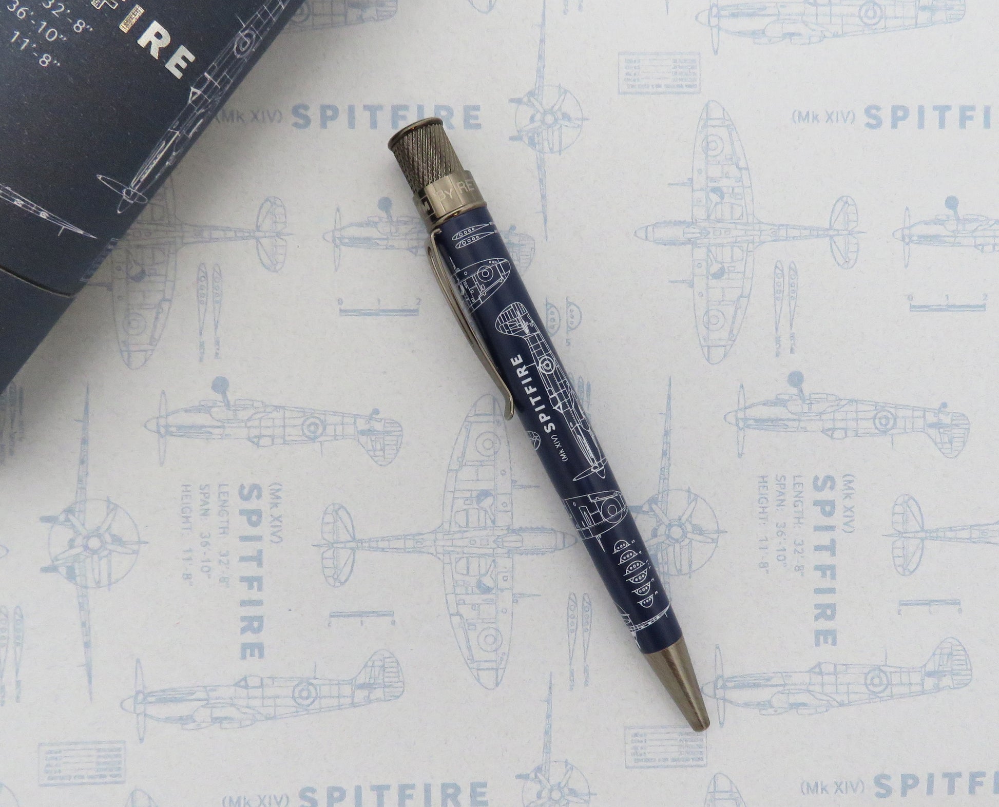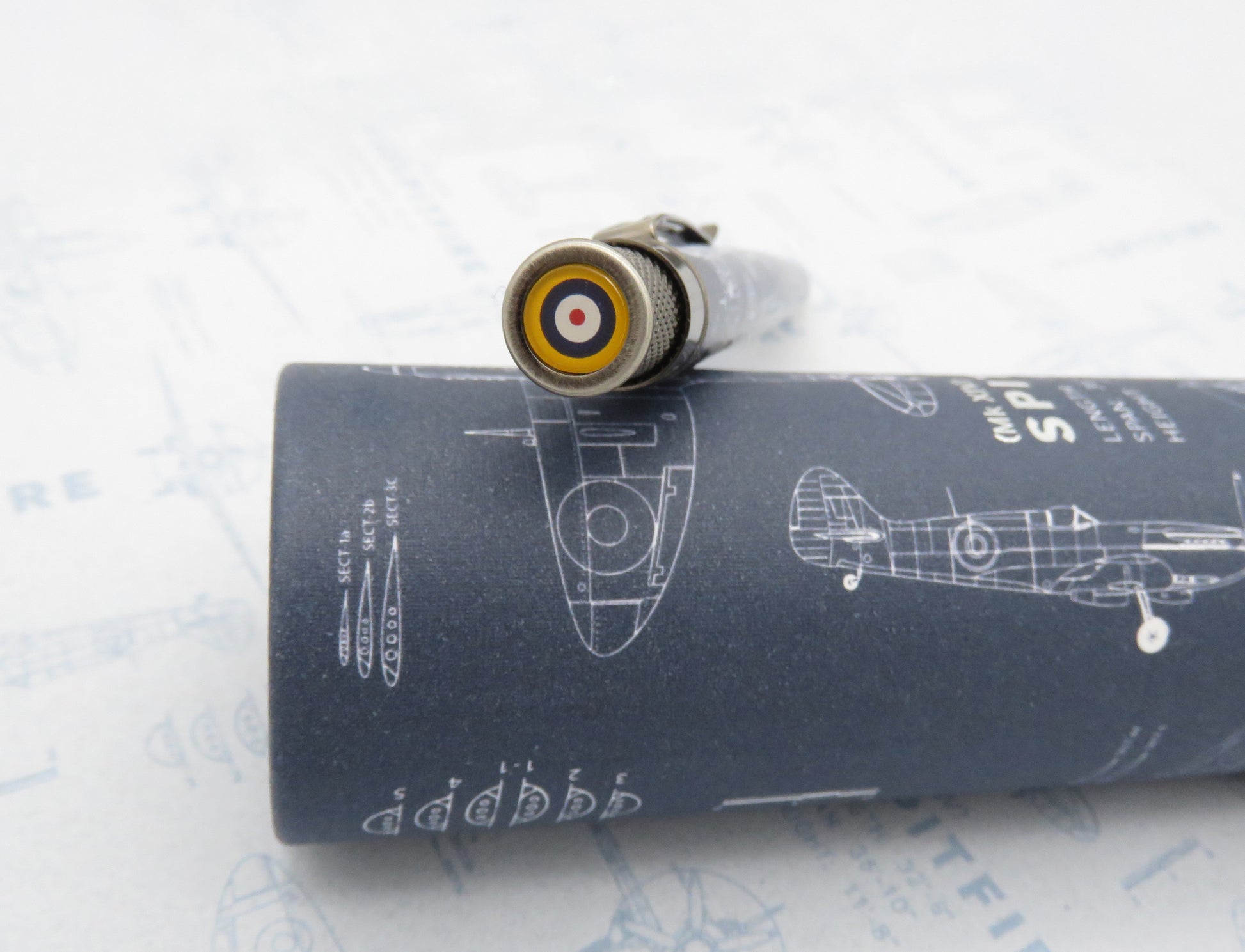 Spitfire schematics printed on a striking navy blue barrel, accented with antique silver