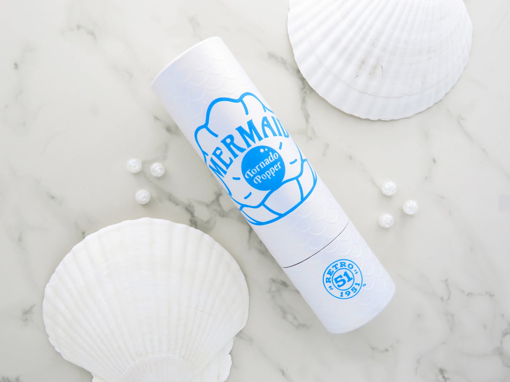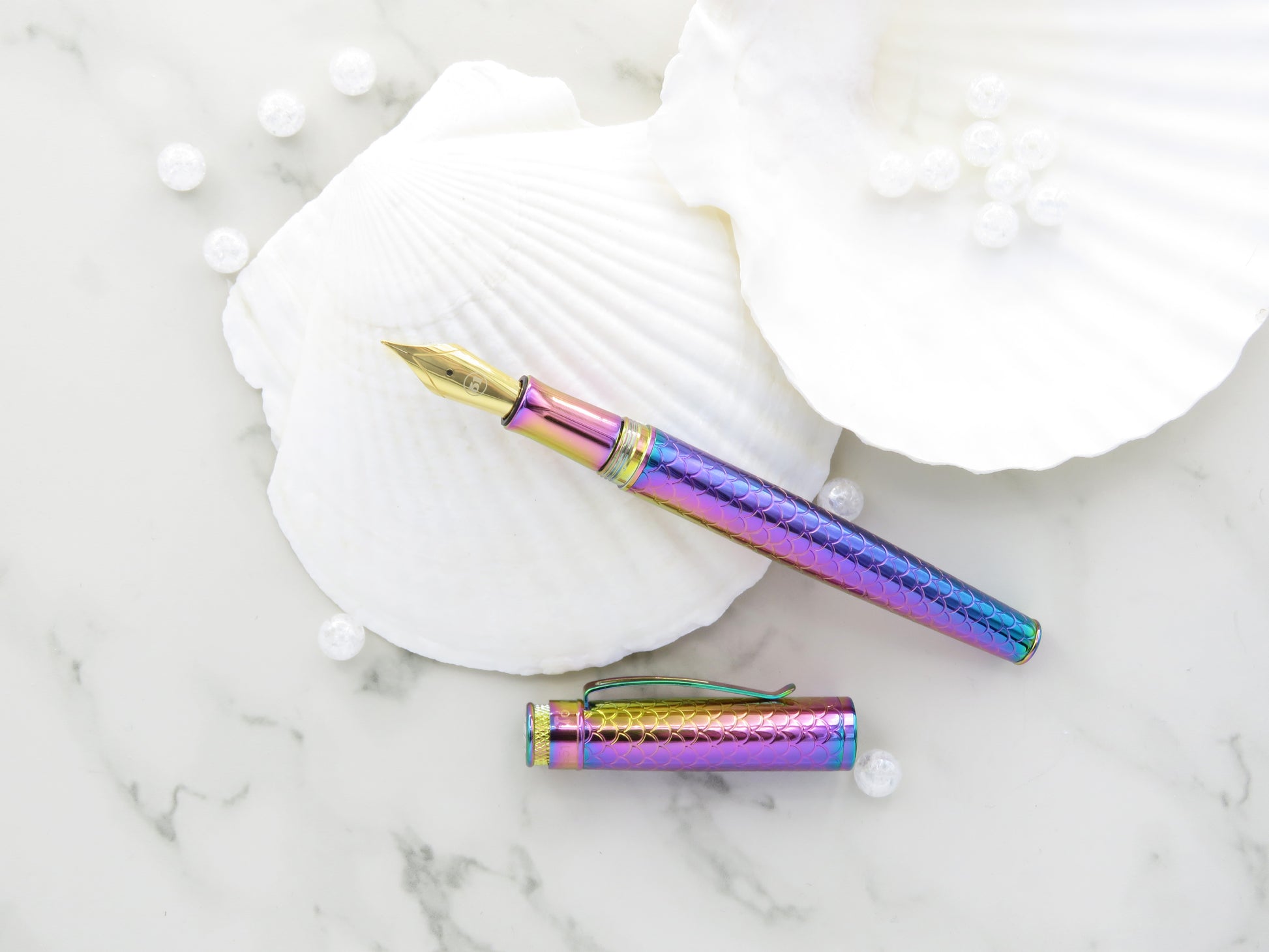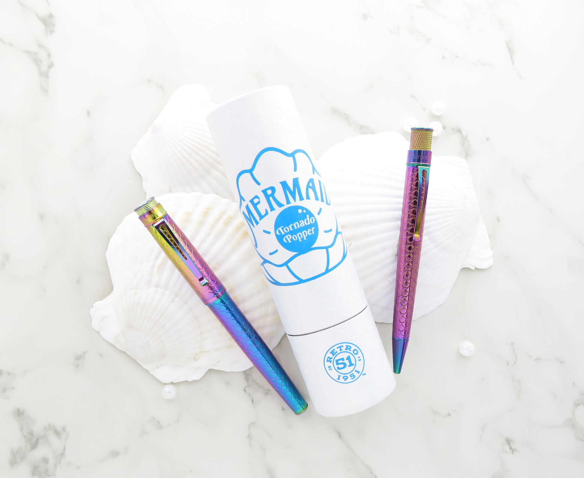 Introducing Retro51’s Mermaid Popper. Crafted to mimic the mesmerising texture of mermaids, this pen is shimmering with rainbow ion plating and adorned with acid-etched scales. Matching accents, a shell-inspired top disc, pearlescent tube packaging, and a gold-colored nib, makes this writing instrument a true siren’s call!