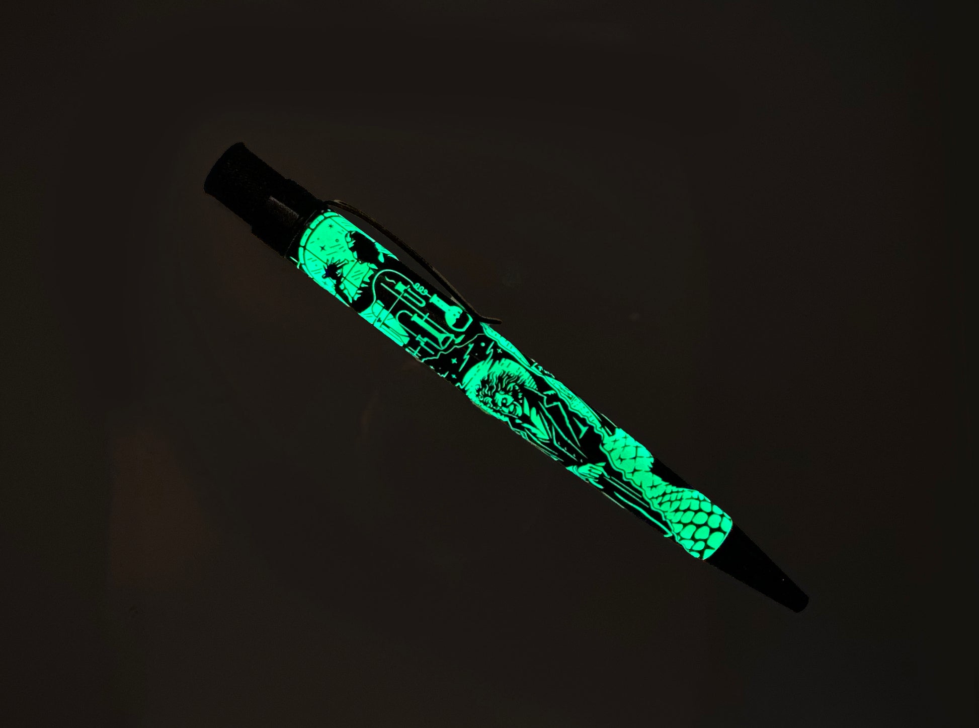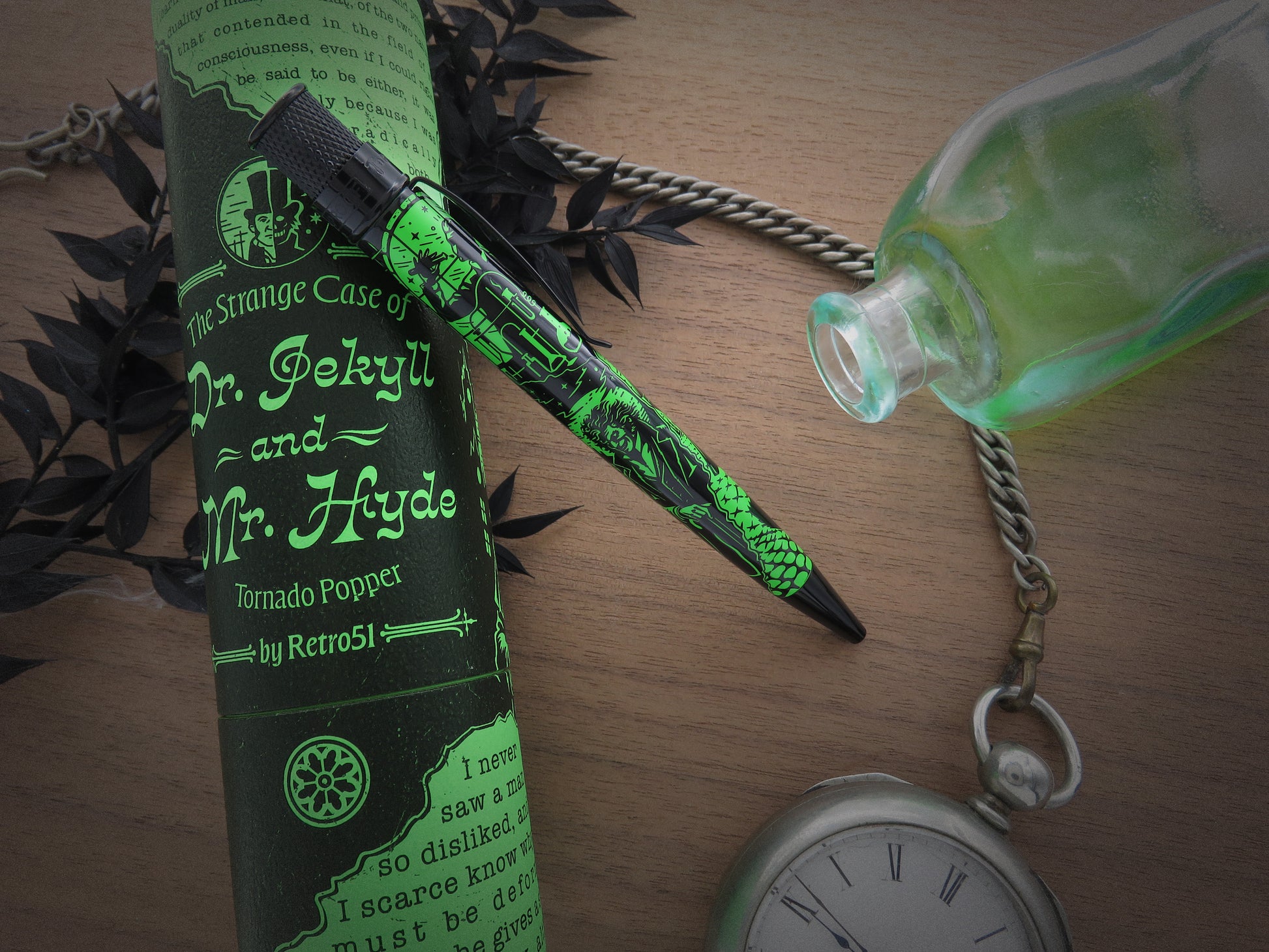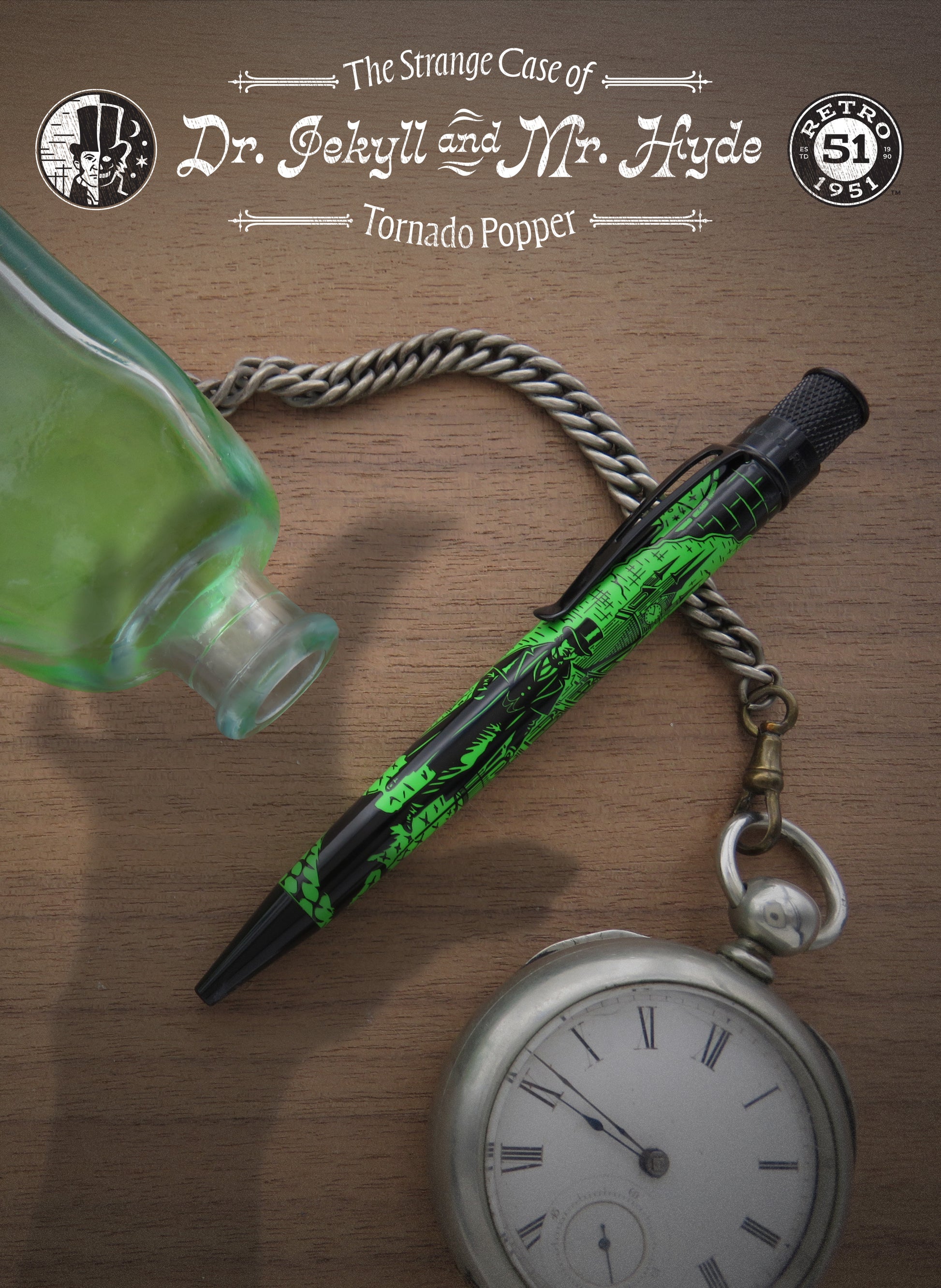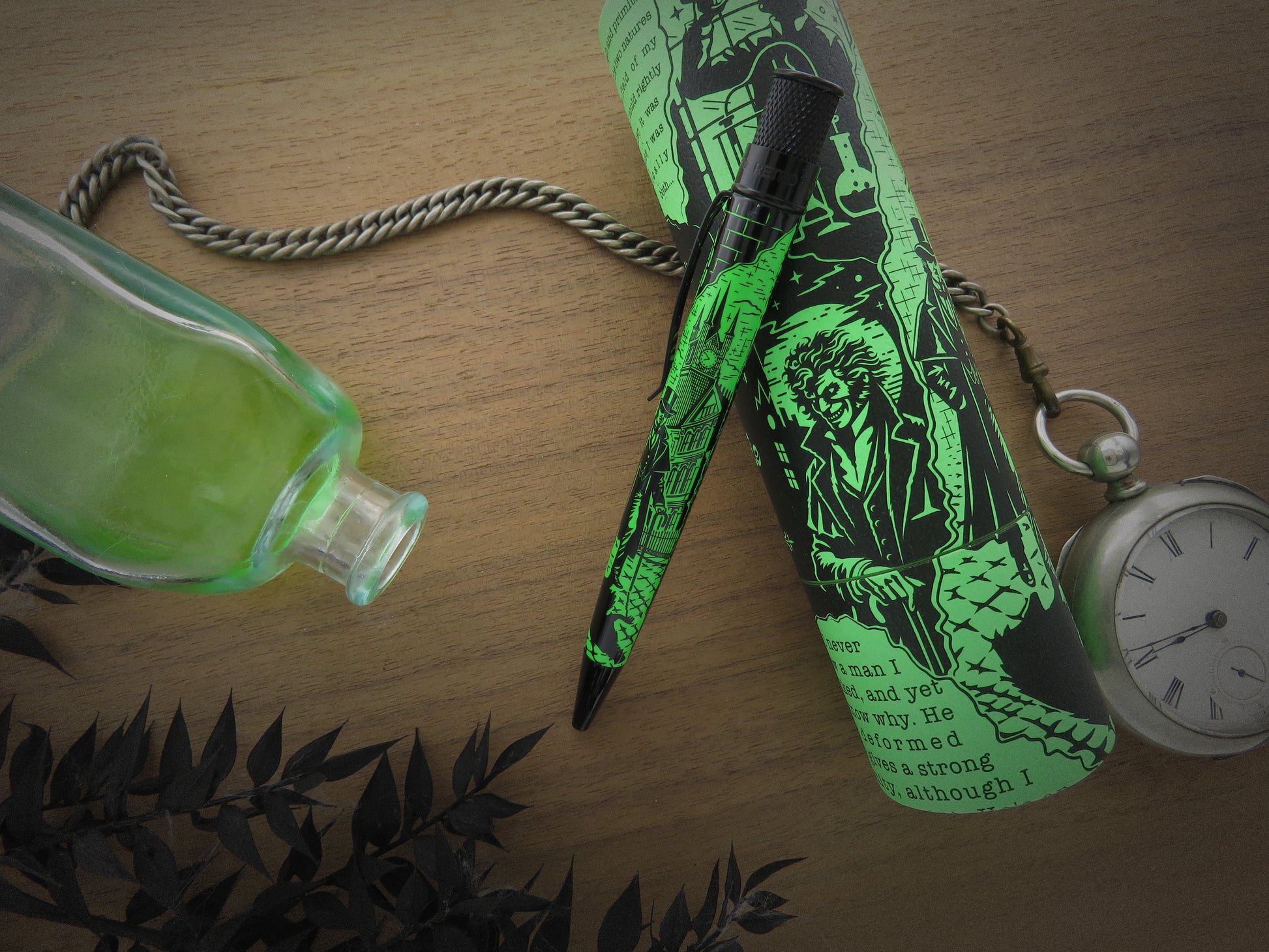 Step into the shadowed streets of Victorian London with Retro51’s newest Tornado™ Popper, inspired by Robert Louis Stevenson’s haunting tale The Strange Case of Dr. Jekyll & Mr. Hyde. This limited-edition rollerball captures the tension between refinement and chaos with a bold design: a neon green glow-in-the-dark barrel printed in glossy black illustrations, a reflection of the doctor’s polished exterior and the sinister figure lurking within. Stealth Black accents sharpen the mood, while the finial features the split personality of Jekyll and Hyde, capping the story’s theme.