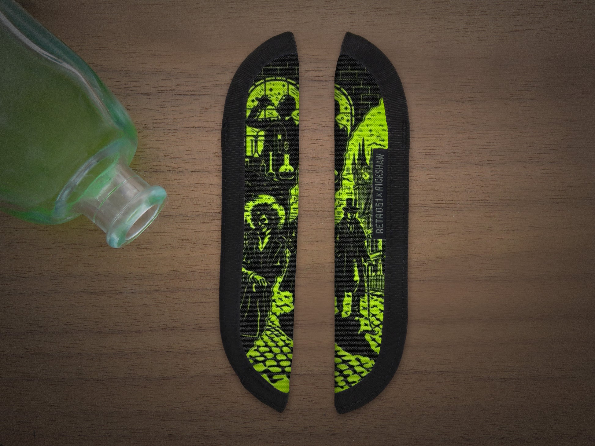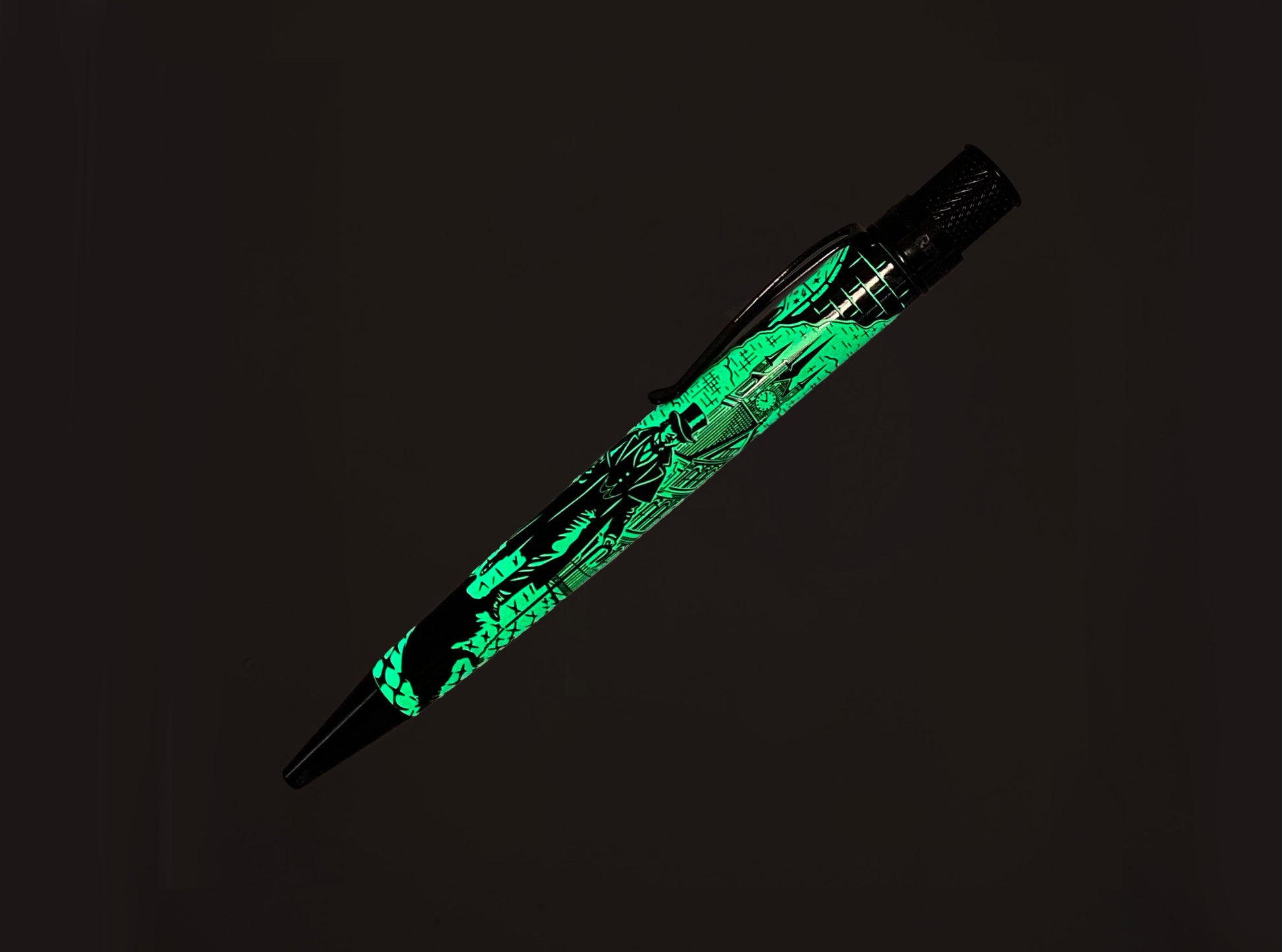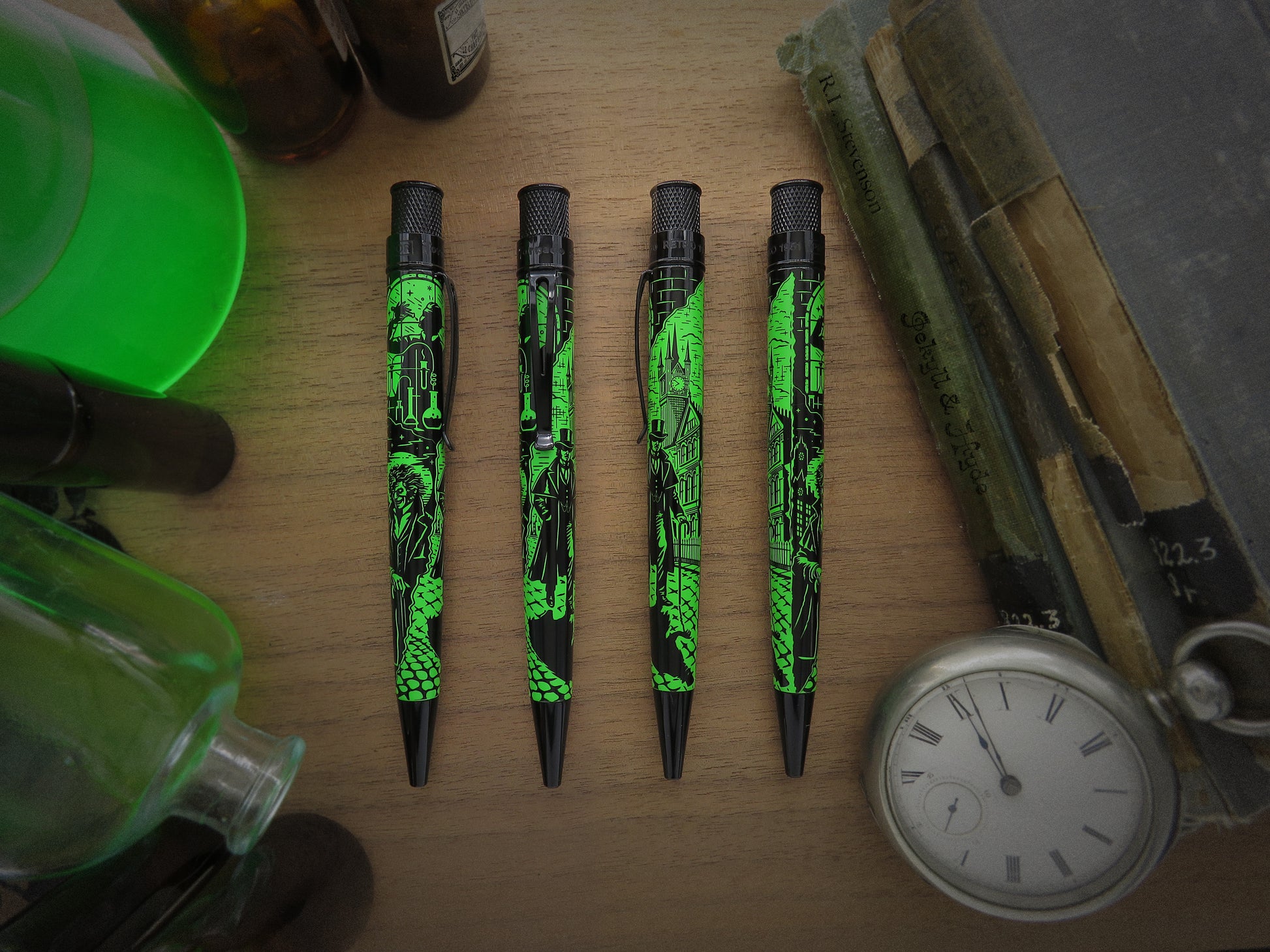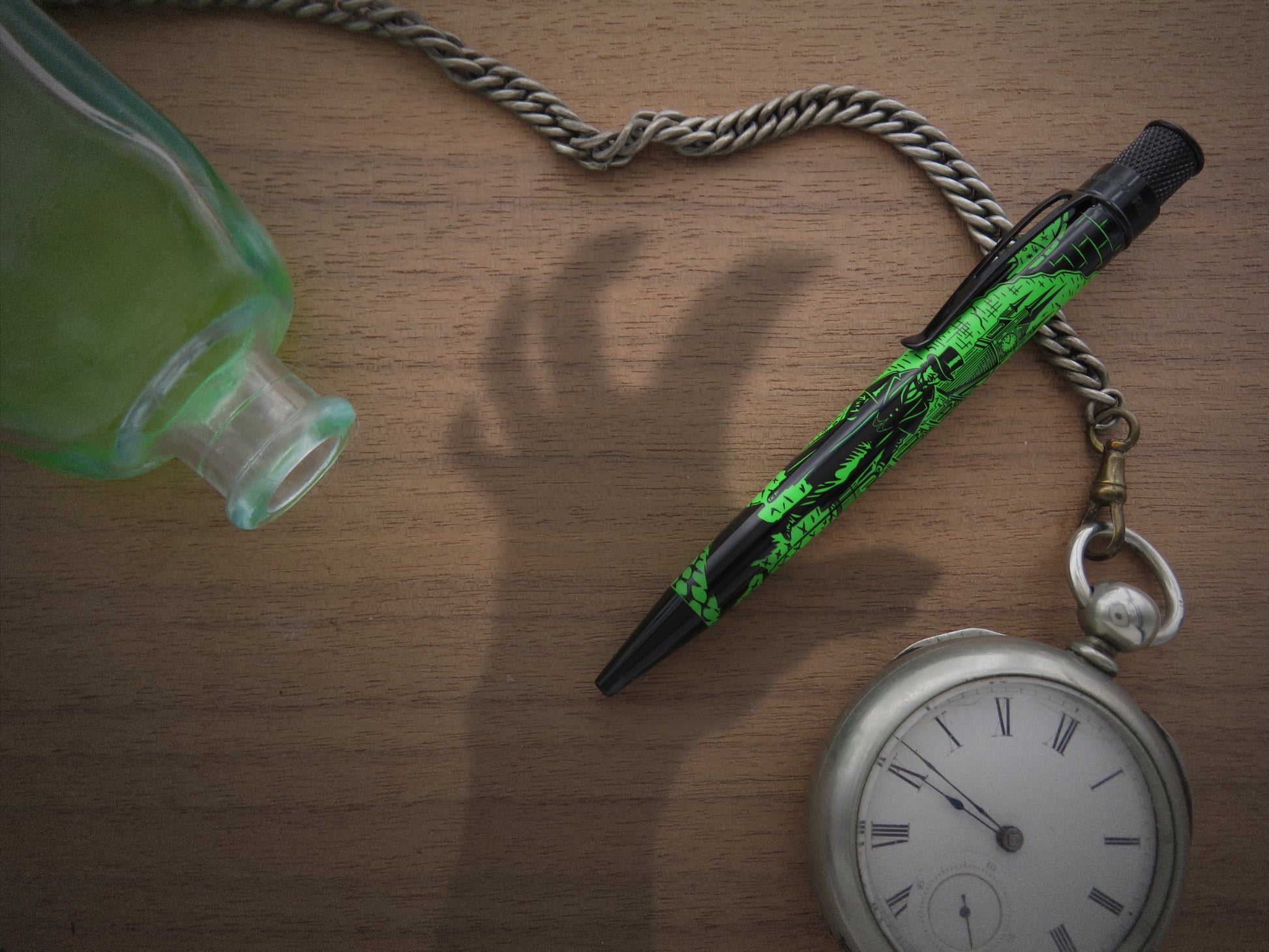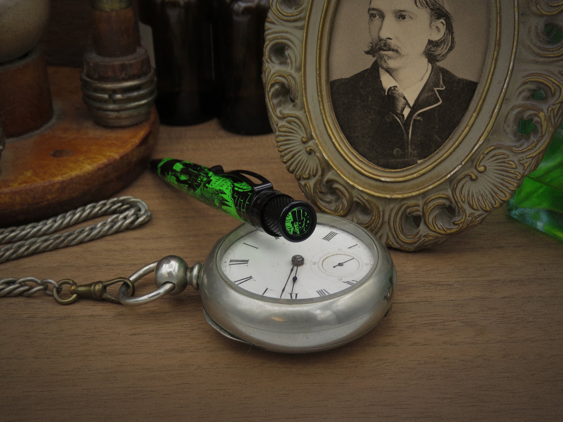 Step into the shadowed streets of Victorian London with Retro51’s newest Tornado™ Popper, inspired by Robert Louis Stevenson’s haunting tale The Strange Case of Dr. Jekyll & Mr. Hyde. This limited-edition rollerball captures the tension between refinement and chaos with a bold design: a neon green glow-in-the-dark barrel printed in glossy black illustrations, a reflection of the doctor’s polished exterior and the sinister figure lurking within. Stealth Black accents sharpen the mood, while the finial features the split personality of Jekyll and Hyde, capping the story’s theme.