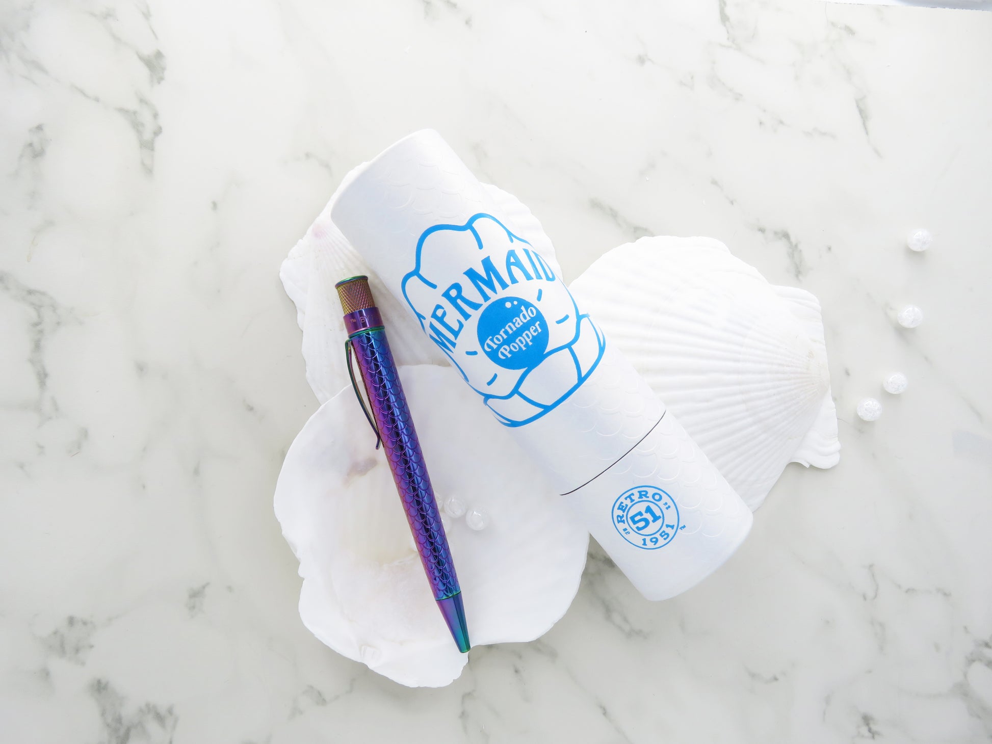 Introducing Retro51’s Mermaid Popper. Crafted to mimic the mesmerizing texture of mermaids, this pen is shimmering with rainbow ion plating and adorned with acid-etched scales. Matching accents, a shell-inspired top disc, and a pearlescent tube, makes this writing instrument a true siren’s call!
