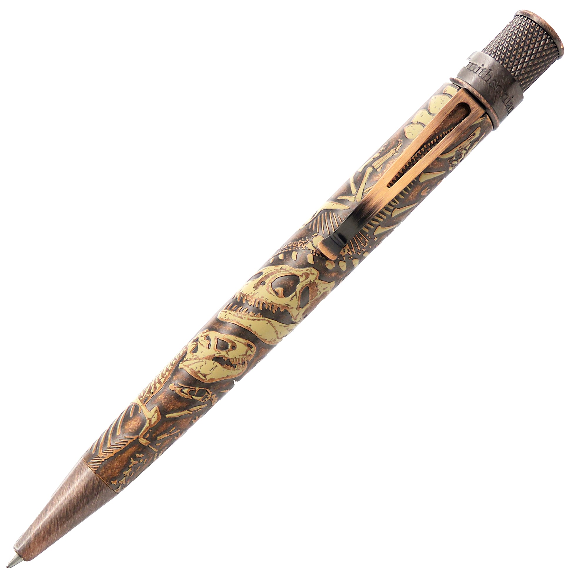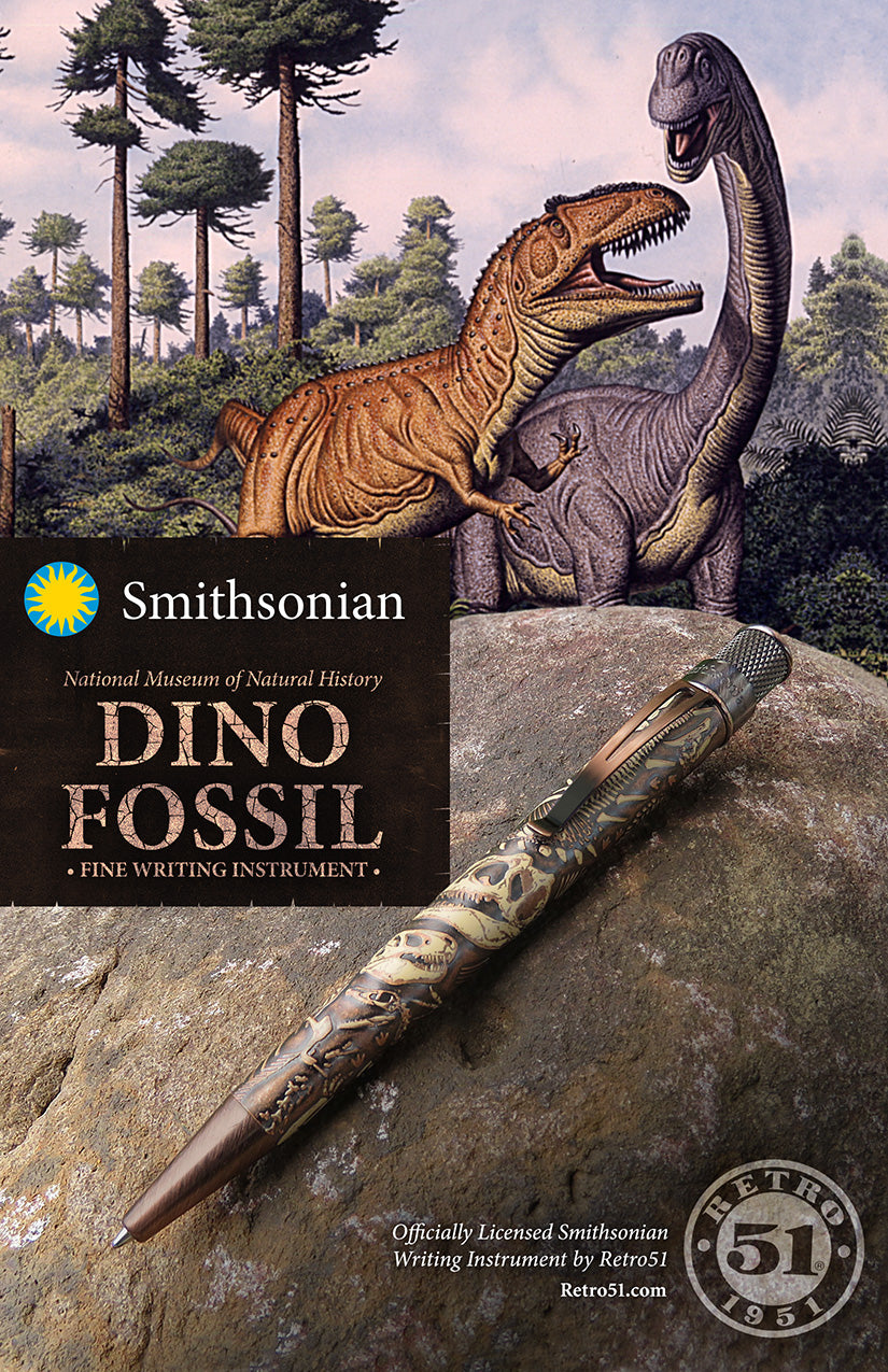 The Retro 51 Smithsonian Collection - Dino Fossil is a retractable rollerball pen with a trademarked knurled twist-top. The barrel is made of stainless steel with an antique copper lacquer. It is a well balanced pen which glides effortlessly across the page.
