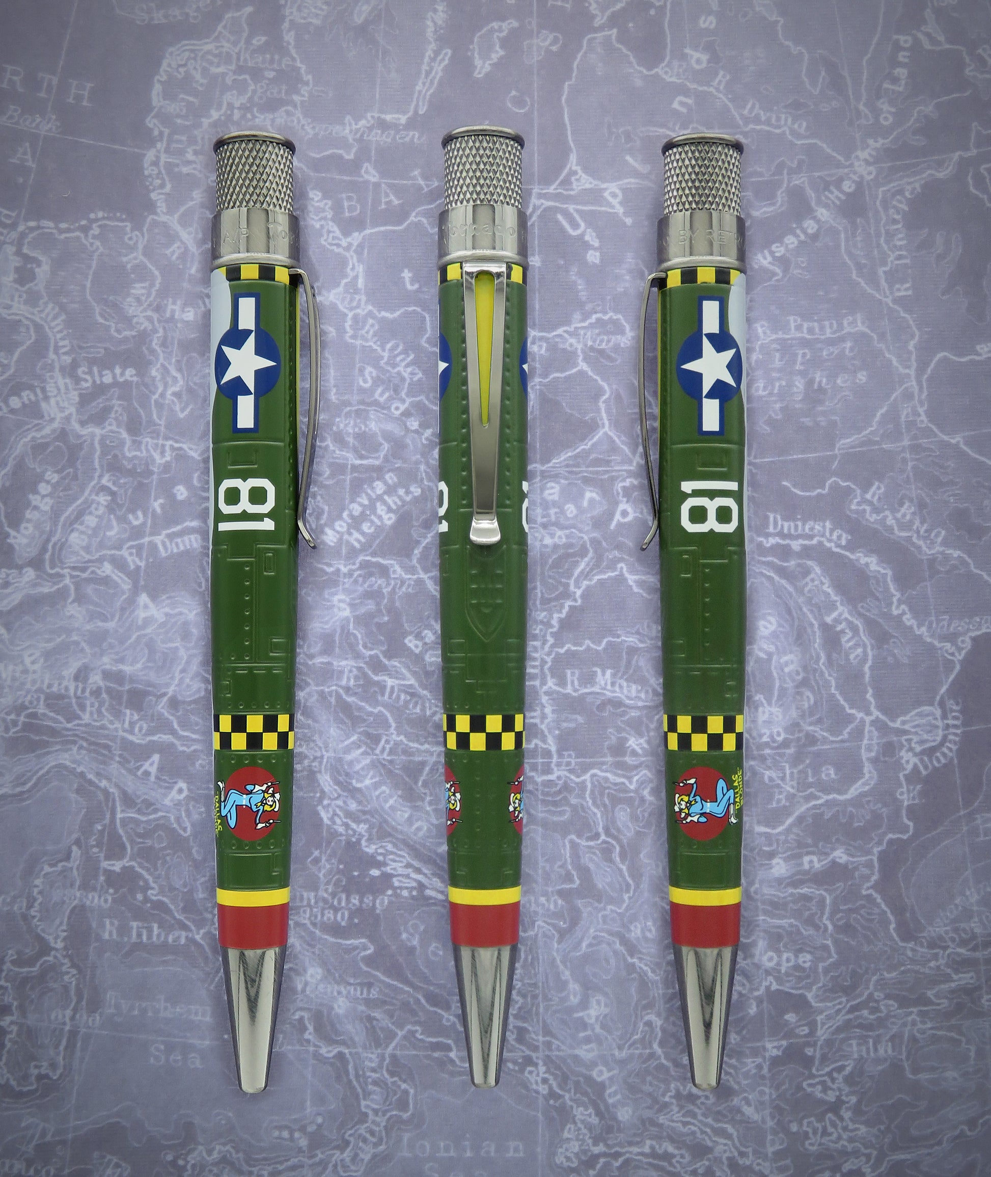 The Retro51 P-47 Thunderbolt is now taking off to fly alongside the P-51 and Corsair in the Vintage Metalsmith series. This warbird rollerball pen is designed after the most popular World War II U.S. fighter plane with over 15,000 units produced. It was known for its heavy artillery that successfully served in offensive air-to-air combat plus skillful ground attack. Its rugged construction allowed it to withstand battle damage and still remain airworthy. The Tornado emulates the P-47 with its acid-etched rivets and paneling on the barrel and painted with the striking red, yellow and green color scheme. It's emblazoned with the nose art of the 352nd Fighter Group's P-47 nicknamed "Dallas Blonde," and complete with antique silver trim and matching checkered finial. Pick up this beaut and prepare for your next mission.