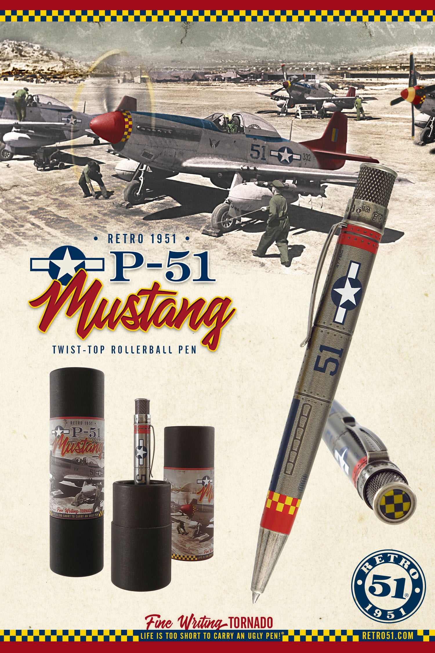 The Retro 51 Tornado Vintage Metalsmith is a retractable rollerball pen with a trademarked knurled twist-top. Unique rollerball designs with antique finishes. Each is packaged in a Retro brand tube. P-51 Mustang pen is acid-etched printing to recreate classic WWII plane. Comes packaged in custom tube.. It is a well balanced pen which glides effortlessly across the page.