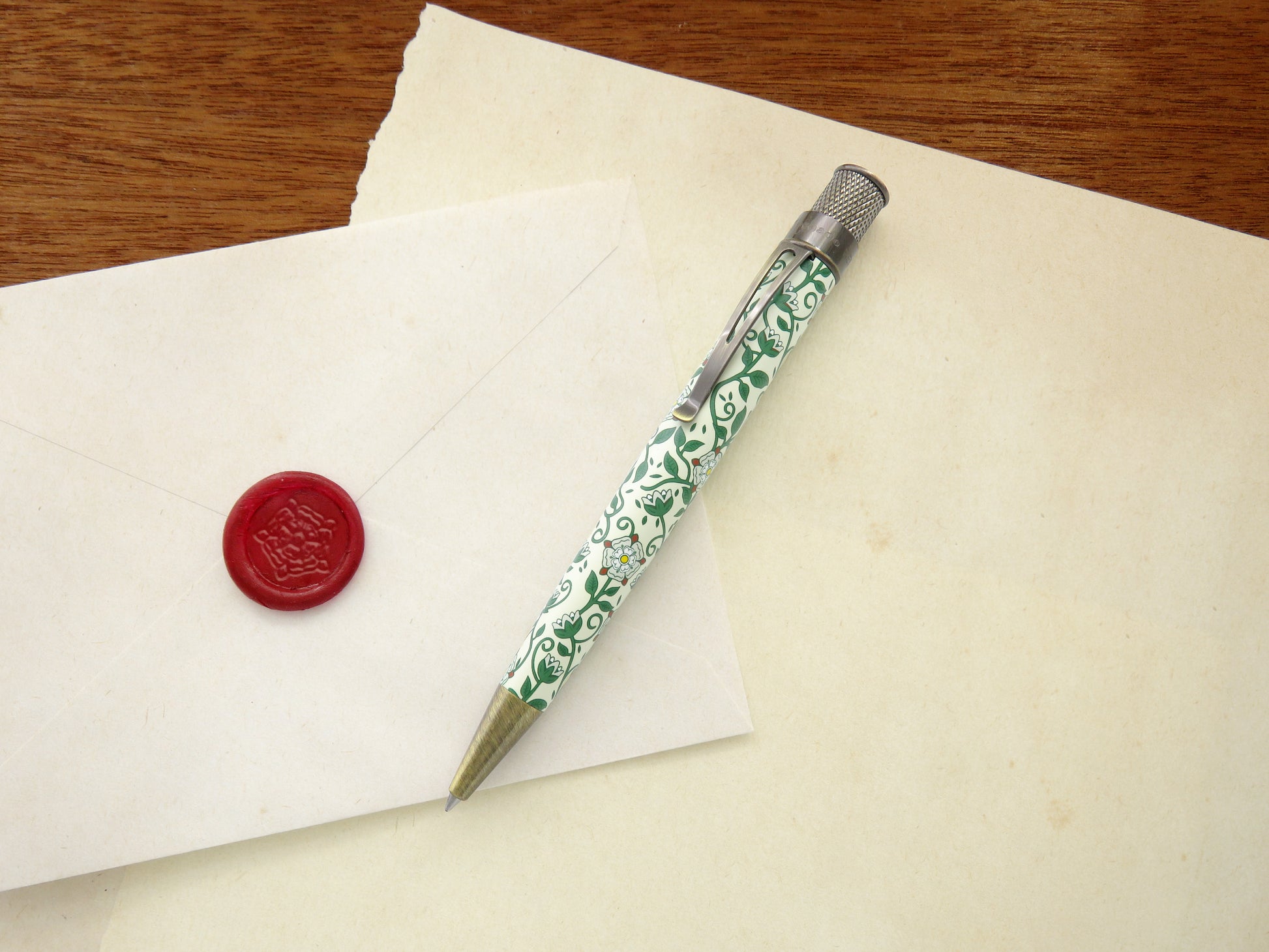 It has antique brass trim which complements the satin floral design of the pen with the York roses emblem on the top disc, finishing off the pen beautifully. The emblem of the white rose was first adopted as a heraldic badge by Edmund of Langley, 1st Duke of York, whilst one of his brothers, John of Gaunt, 1st Duke of Lancaster adopted a red rose. The last King to use the York rose was Richard III whose body was found under a carpark in 2015 in Leicester!