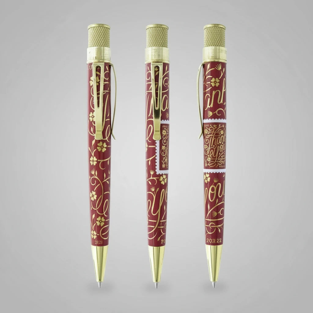 Inspired by the warm tradition of sending gratitude through the post, the Retro 51 Tornado – Thank You Editionshowcases the 2020 USPS® stamp designs by Dana Tanamachi. Each rollerball features all four original colours—Purple, Blue Gray, Muted Green, and Soft Maroon—printed over a brass barrel that mimics the gold foil of the stamps. Finished with polished brass accents, a floral finial, and official USPS® engravings, it’s a writing instrument made to express appreciation with style.