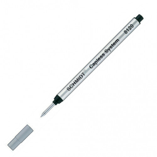 The Schmidt 8120 capless rollerball refill has a metal tube and front section, and a stainless tip with a 1.0mm ceramic ball. One year cap-off time, it is available in black or blue.