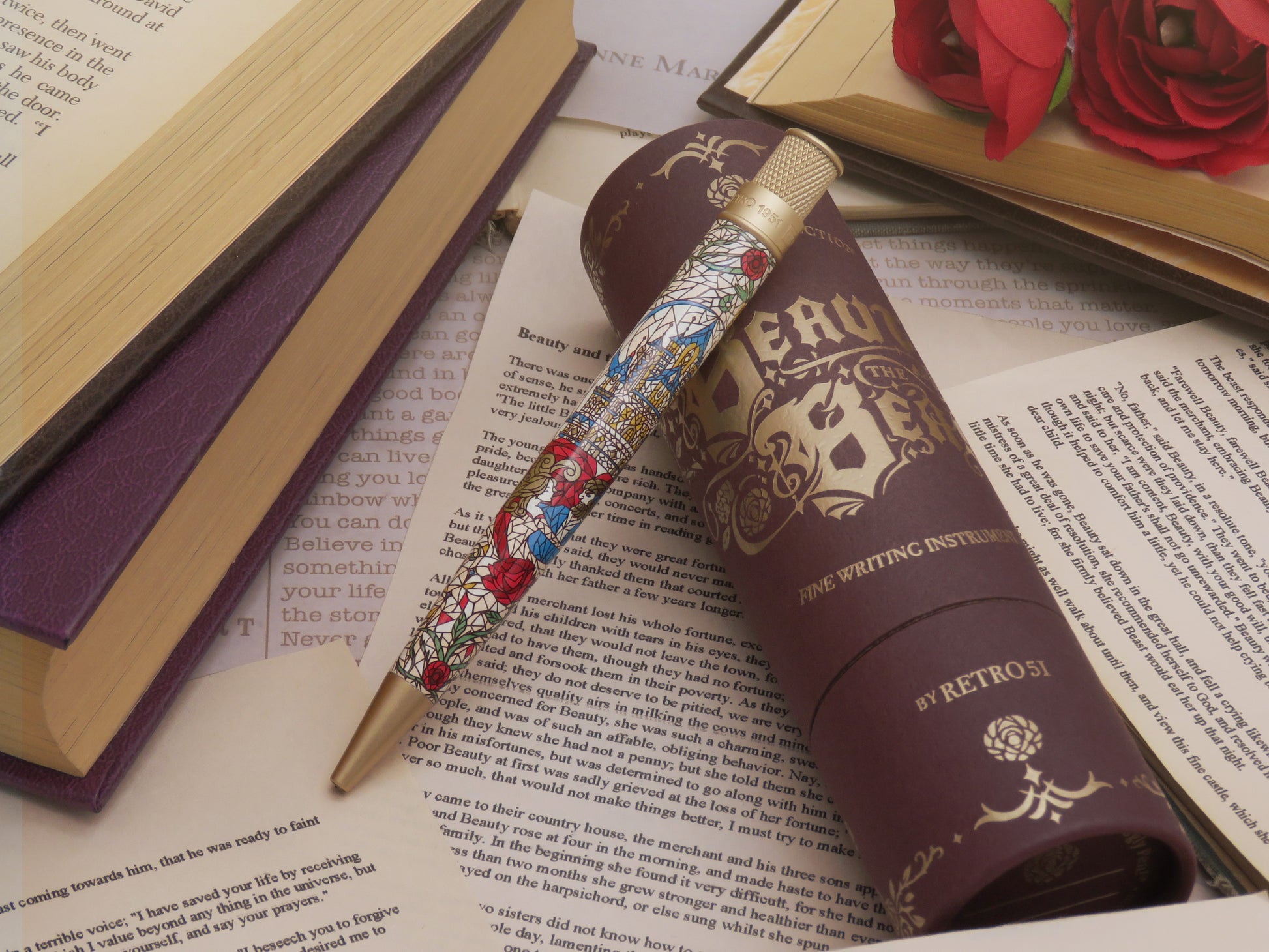 The newest addition to Retro51’s Literary Collection, Beauty and the Beast features a stained-glass–inspired design. The illustrated scene is framed within a heart, capturing Beauty and the Beast alongside the witch’s curse, the enchanted castle, and the iconic rose—symbols of love, transformation, and the passage of time. Accented with cream-gold metallic trim and topped with a sculpted rose finial, this rollerball pen is housed in a burgundy collector’s tube with gold foil details—regal, refined, and ready to be treasured.